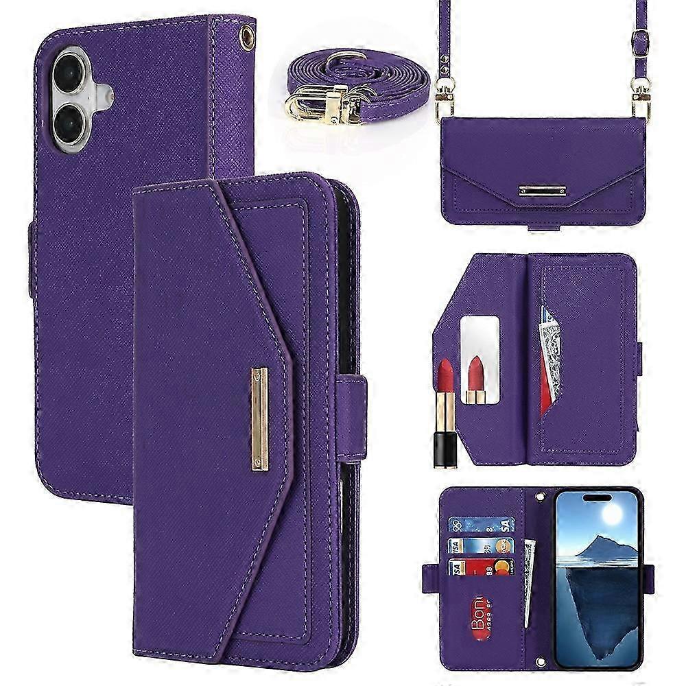 Premium iPhone 17 Cross Texture PU Leather Wallet Case with Shoulder Strap & Makeup Mirror - Compatible with iPhone Users