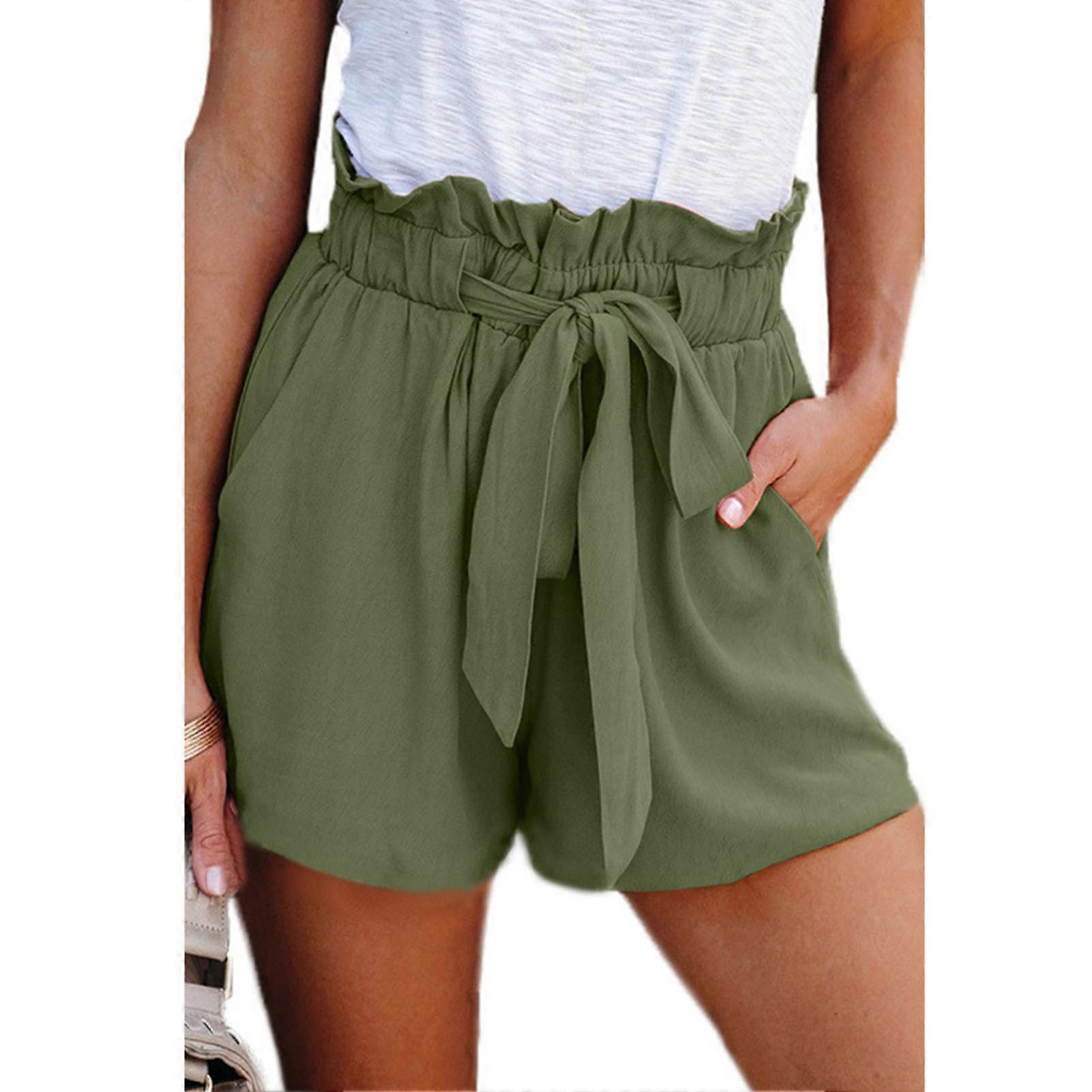 Women Tie Elastic High Waist Loose Fit Casual Pure Color Lady Wide Leg Shorts with Pockets for Daily Dating