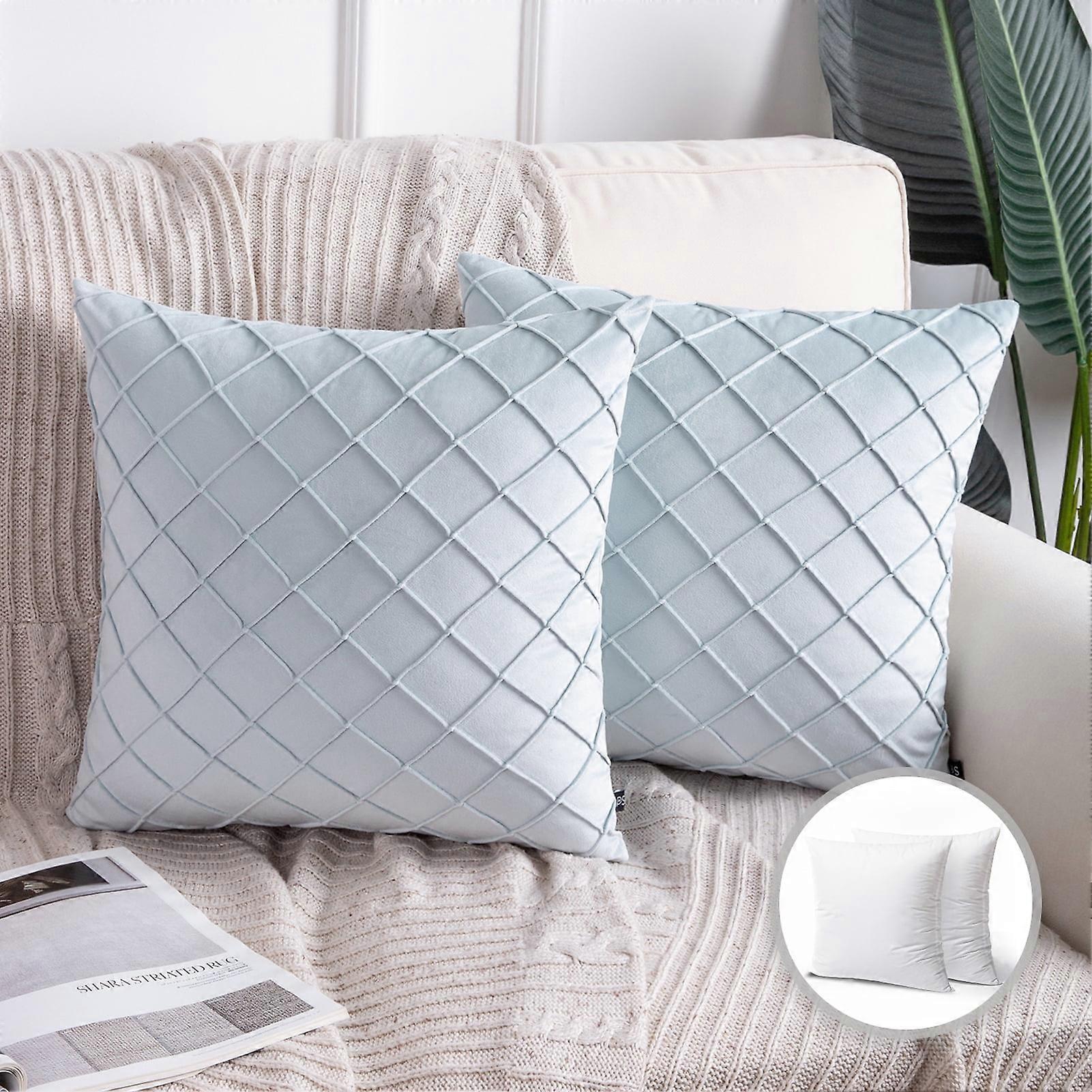 Phantoscope Velvet Series Pleated Checker Decorative Throw Pillow, 18" x 18", Light Blue, 2 Pack