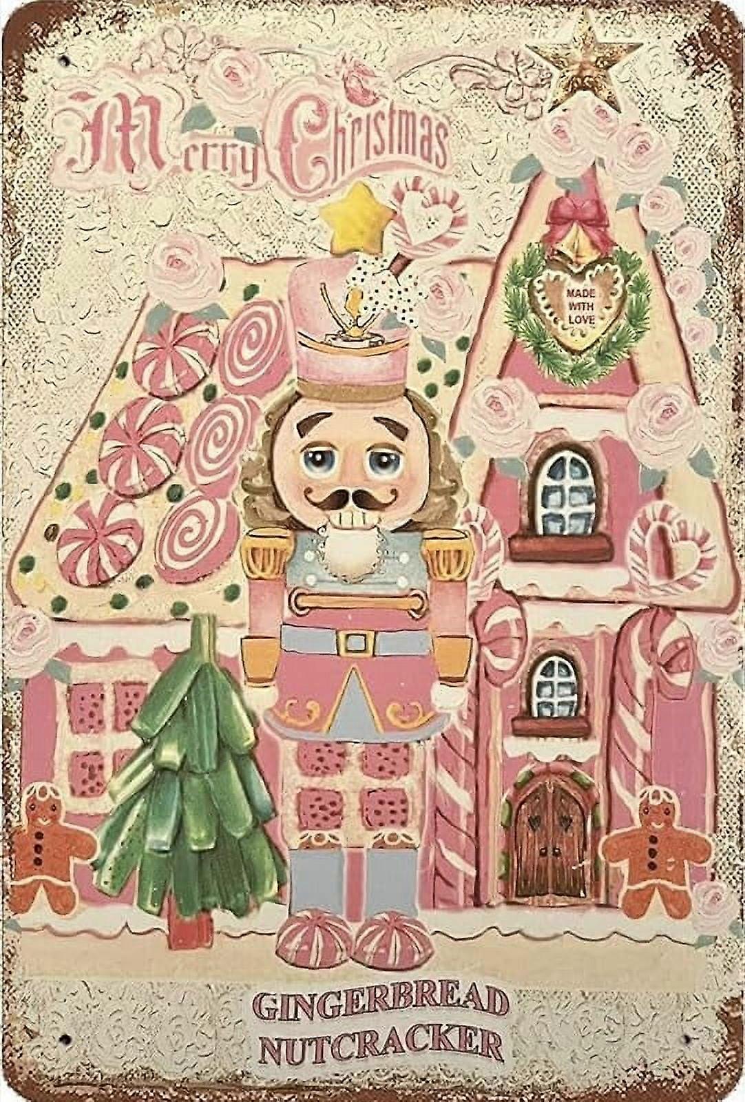 French Shabby Pink Christmas Nutcracker Sign, 8x12" Retro Vintage Metal Tin Wall Art for Home Coffee Bar Garage Decor Gift
