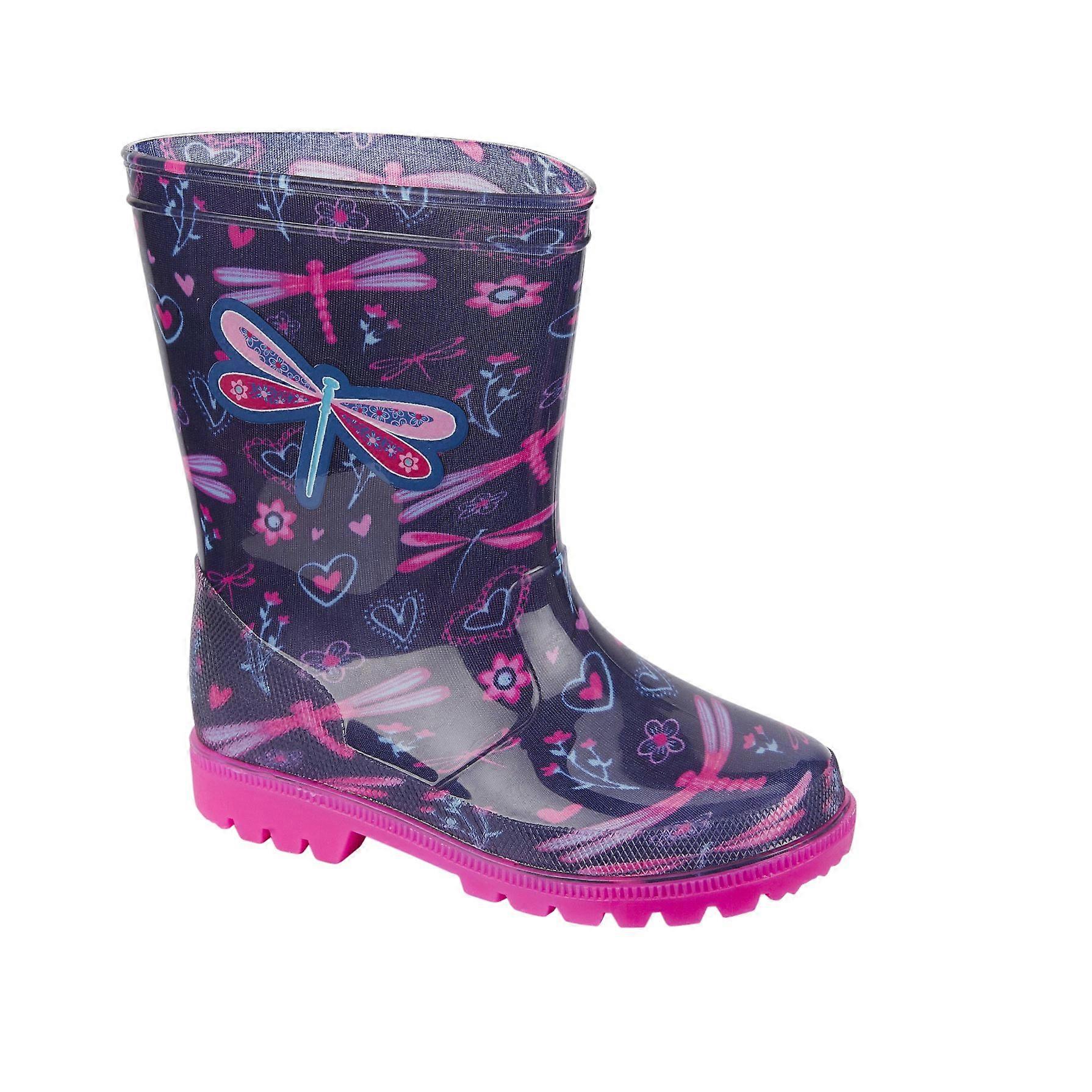 Kids Girls Dragonfly Wellington Waterproof Rain Boots with Heart & Flower Print