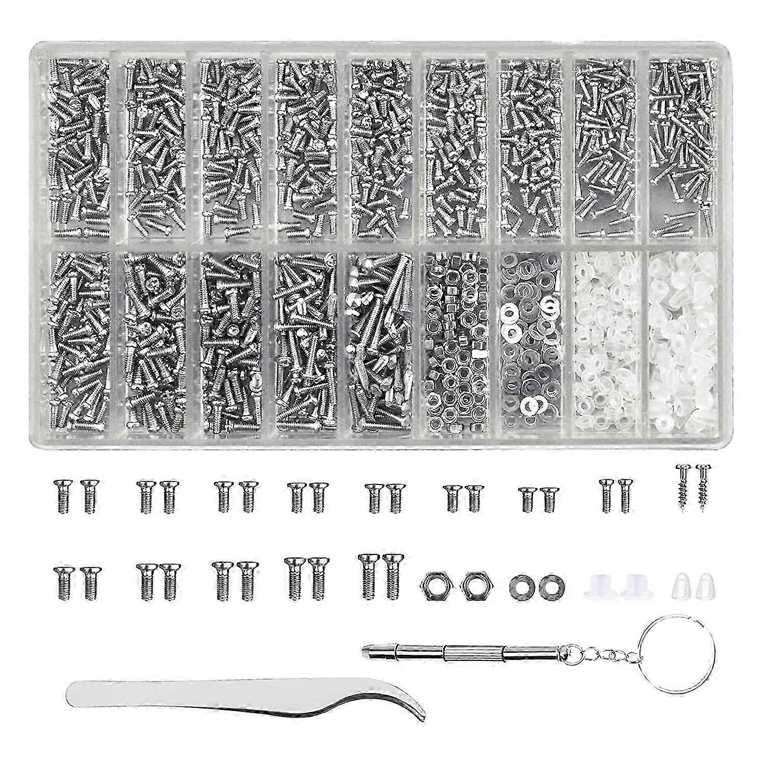 Usage Tips:Use our glasses repair tool kit, no longer worry about glasses screws loose or fall! This mini screwdriver set allows you to repair your glasses at home without worrying about losing or loosening screws. It can repair glasses, sunglasses, computers, mobile phones, small electronic devices, clocks, watches and other equipment with small screws. Screw type: 18 kinds Quantity: 1000pcs Product Features: Colour:Silver Material:stainless steel Size:10.8 x 6 x 1.3cm Package Contents: 1 box x screws and nuts 1 x tweezers 1 x screwdriver Only the above package content, other products are not included. Note: Light shooting and different displays may cause the color of the item in the picture a little different from the real thing. The measurement allowed error is +/- 1-3cm.