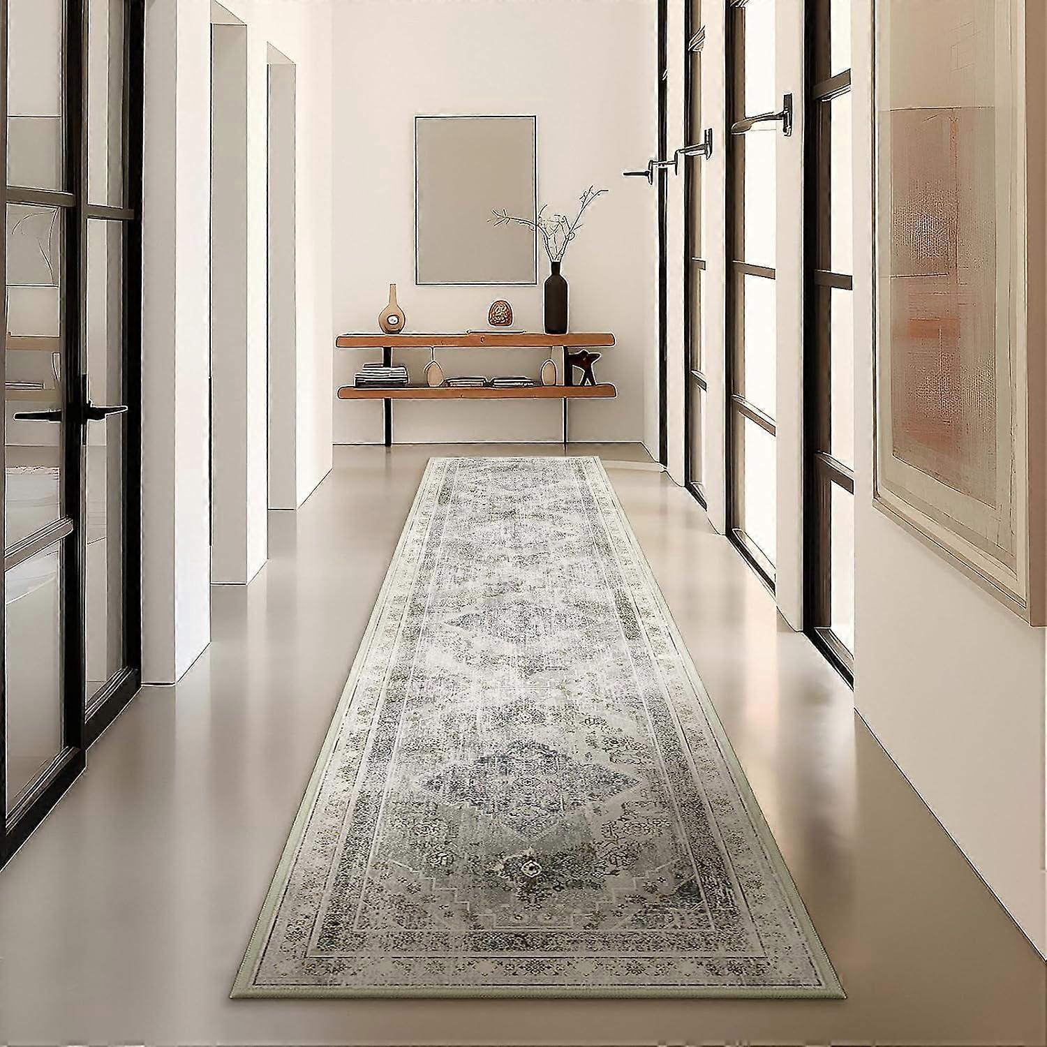 Boho Washable Non-Slip Hallway Runner Rug 2x8 ft, Light Gray - Vintage Distressed Accent for Kitchen, Entryway, Laundry, Bedroom