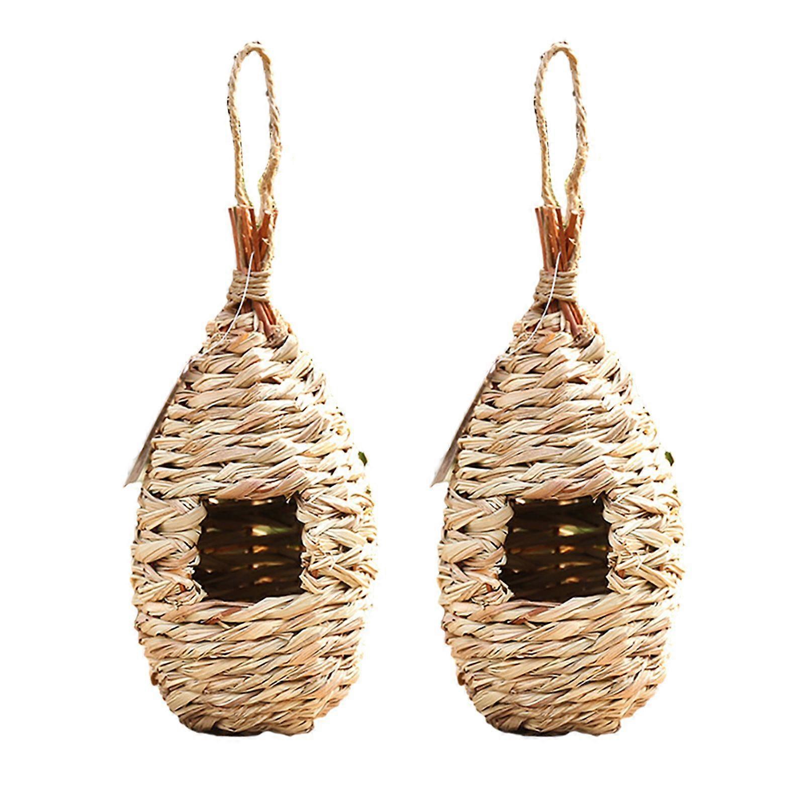 2Pcs Outside Hanging Hummingbird Birds House Natural Grass Hut Outdoor Garden Hand Woven Wren Sparrow Finch Chickadee Roosting Pocket Nest