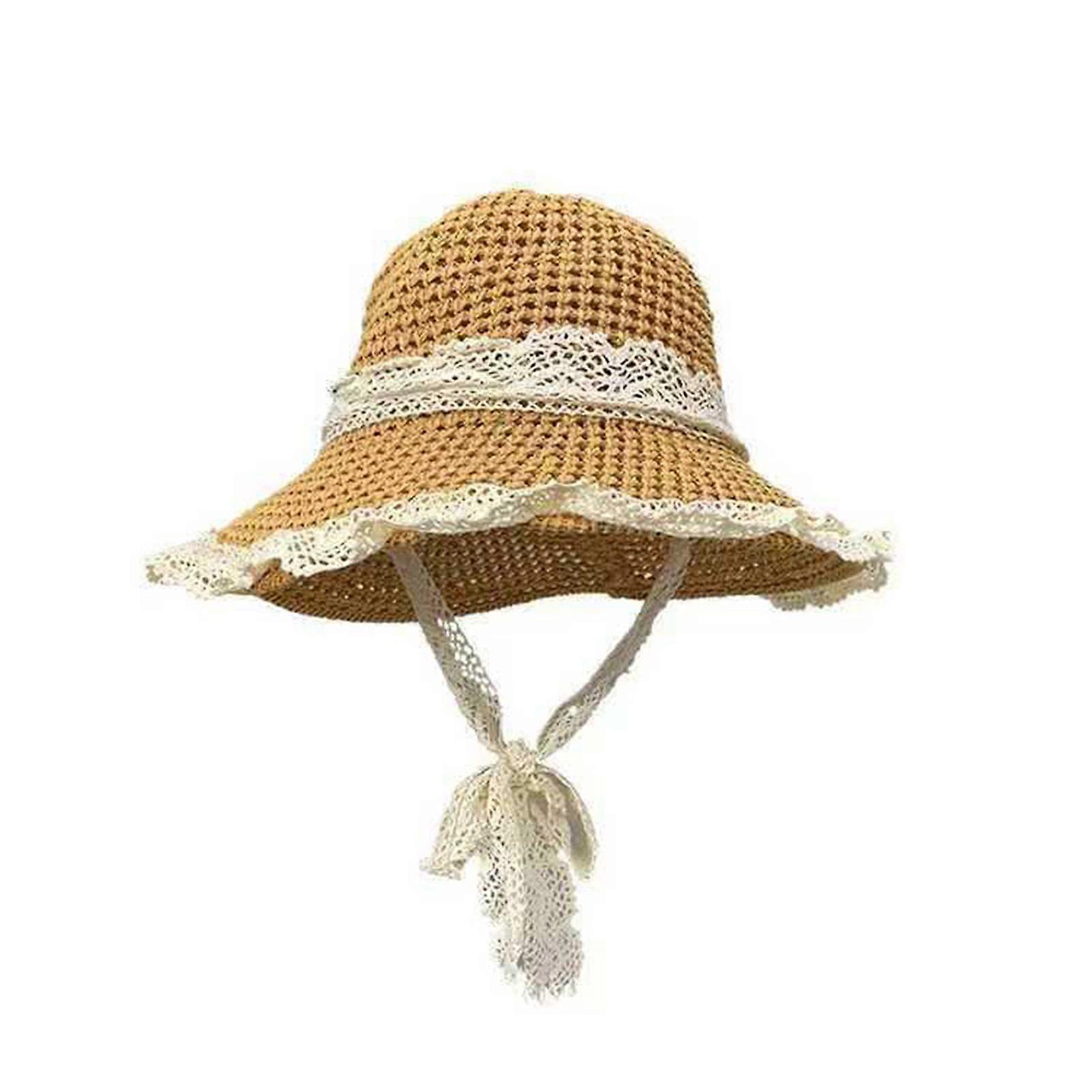 Wide Brim Straw Sun Hat Knitted Hollow Straw Bucket Hat with Lace Strap Decoration Summer Beach Hat for Hiking Outing Traveling