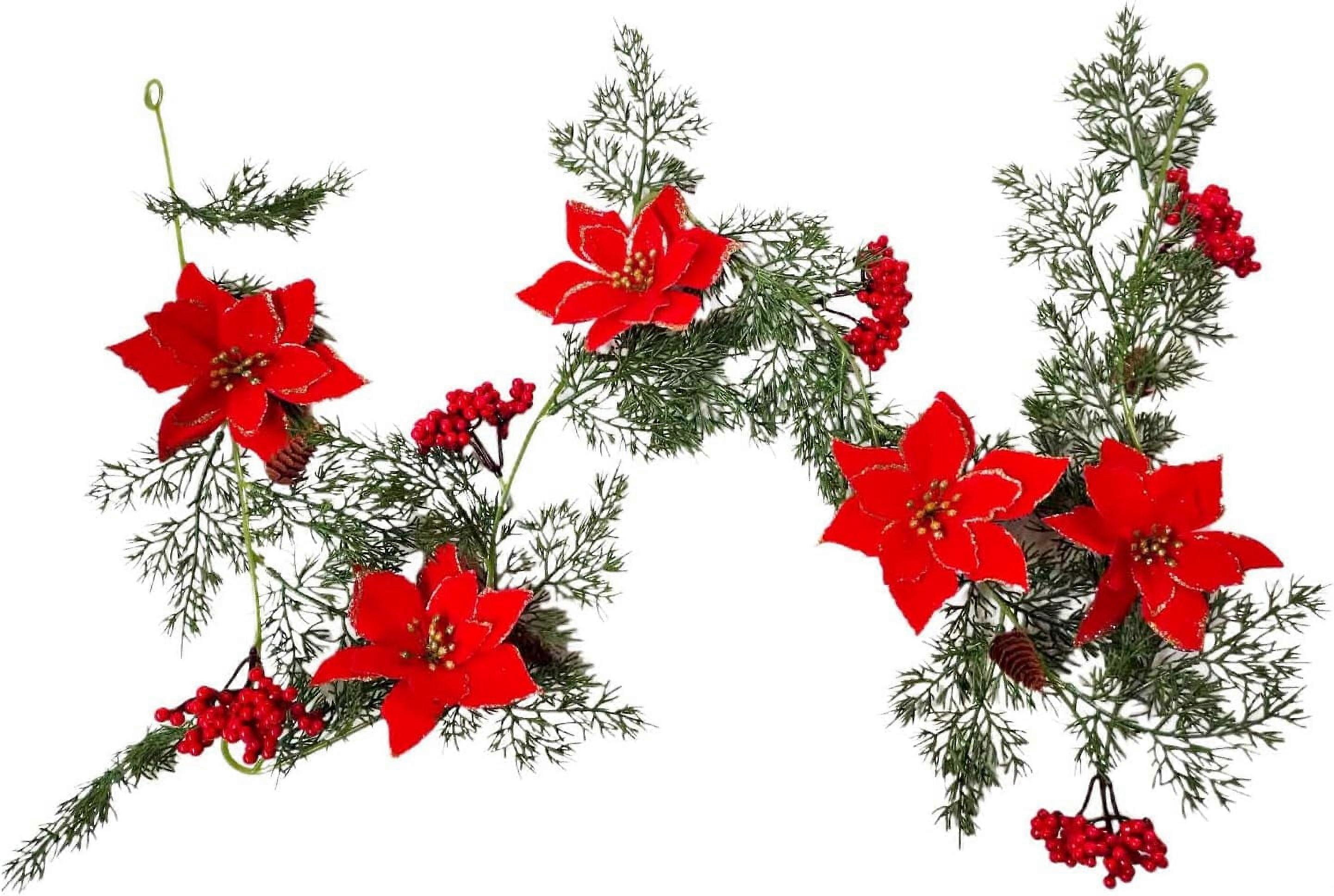 5.7 Ft Christmas Poinsettia Garland,Artificial Poinsettia Garland with Red Berries Fake Poinsettia Vines for Home Christmas Holiday Party DIY Decor