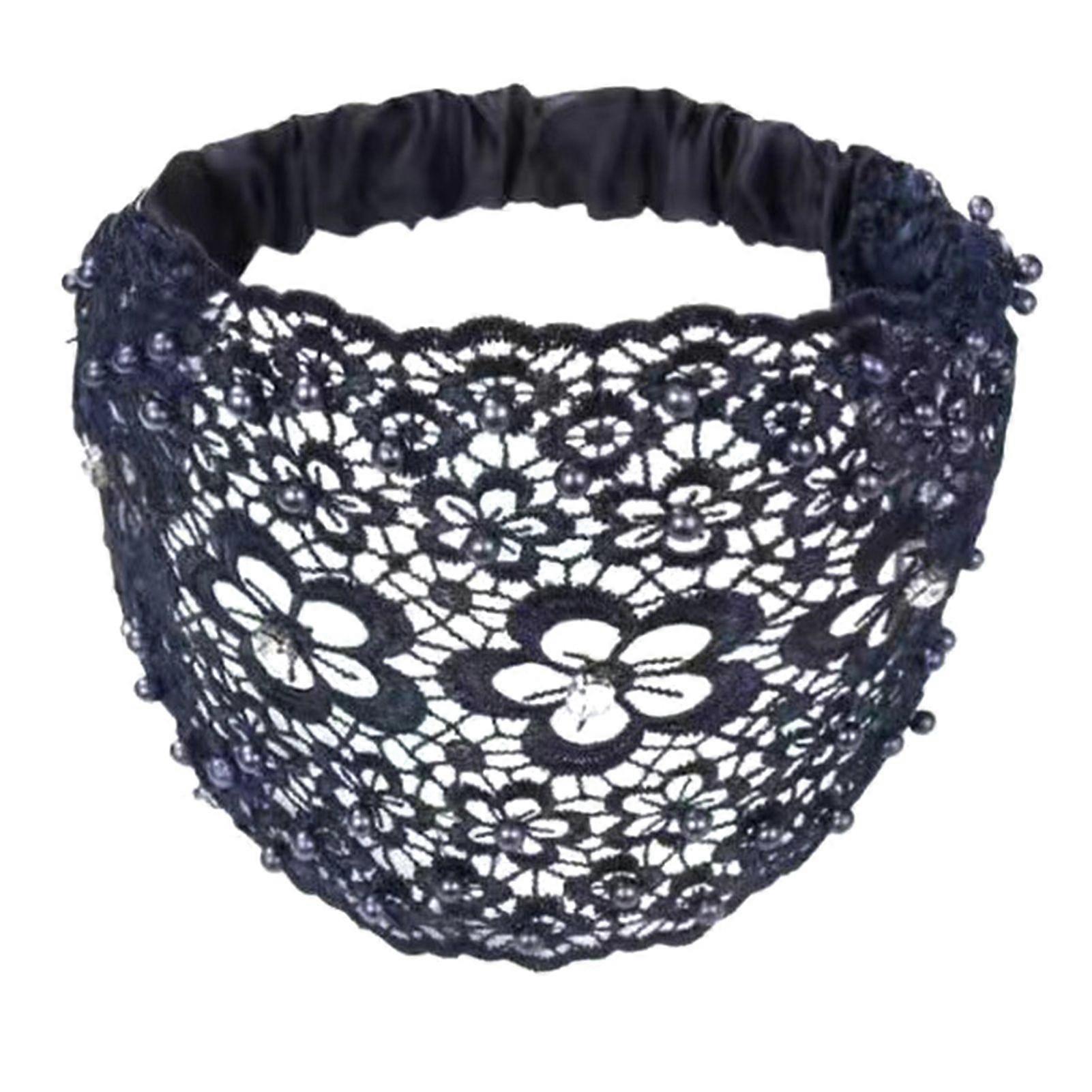 Faux Pearl Embellished Lace Headband Women High Elastic Wide Hair Band with 5 Petal Flower Design Hair Accessories