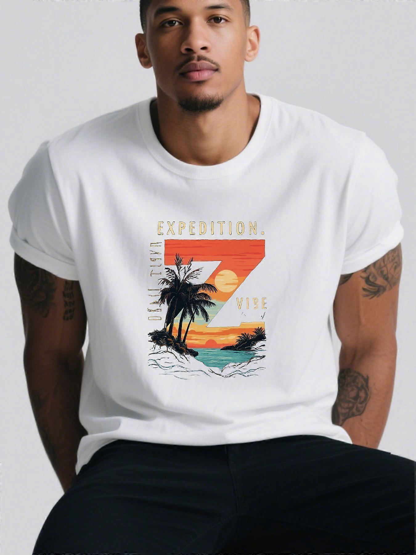 Expedition Vibe Tropical Sunset Graphic T-Shirt - Navy Blue Crew Neck Cotton Tee, Comfortable Fit, Summer Breathable Shi-Akgds