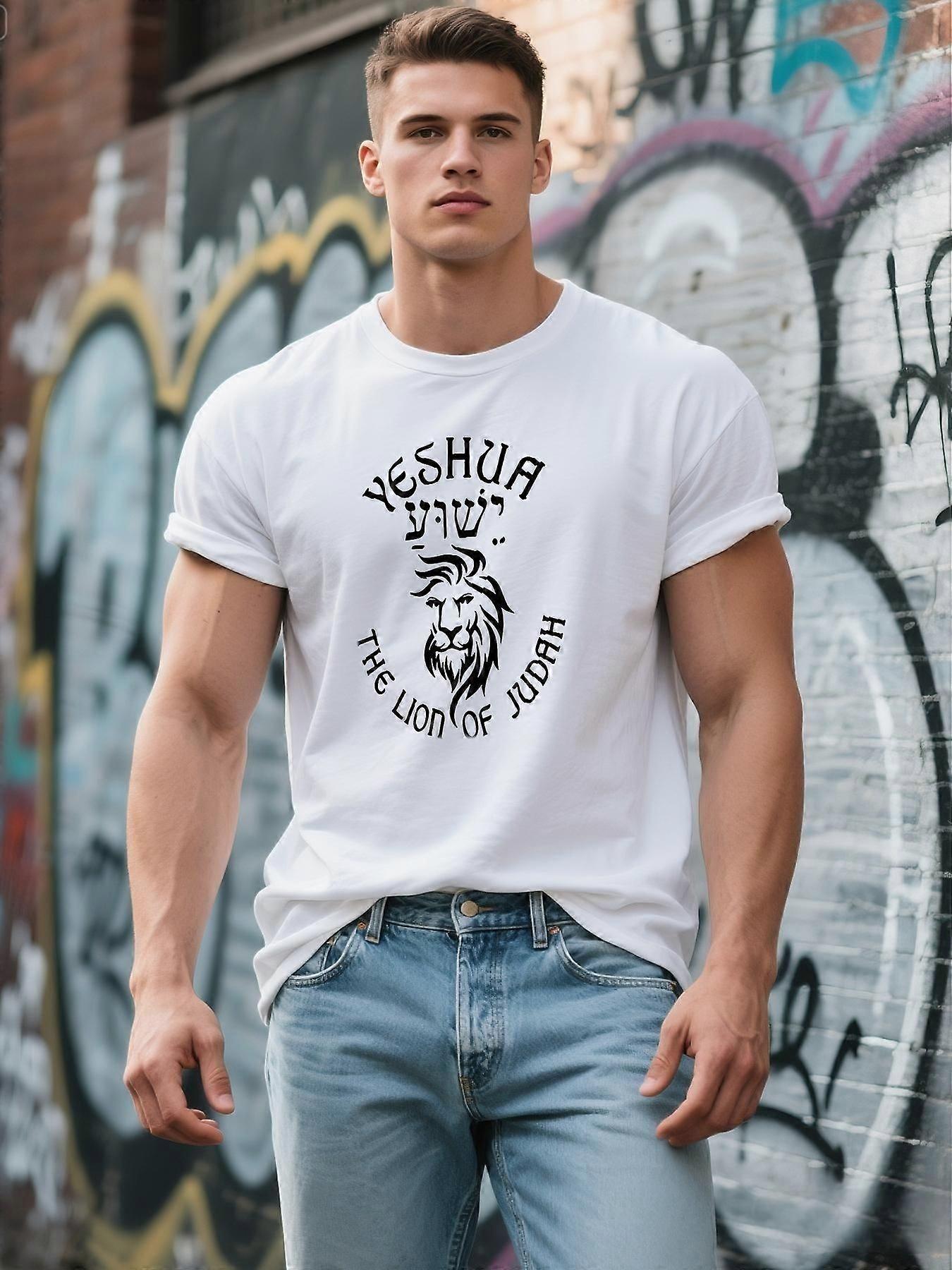 Men's Lion Graphic T-Shirt - Streetwear Casual Short Sleeve Cotton Top with Hebrew Text Design, Regular Fit All-Season C-Almwy