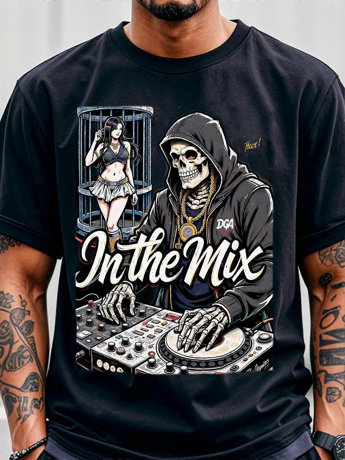 Men's Skeleton DJ "In the Mix" Graphic T-Shirt - White Hip Hop Streetwear Tee with DJ Turntable Art & Music Notes, 100% -Almwy