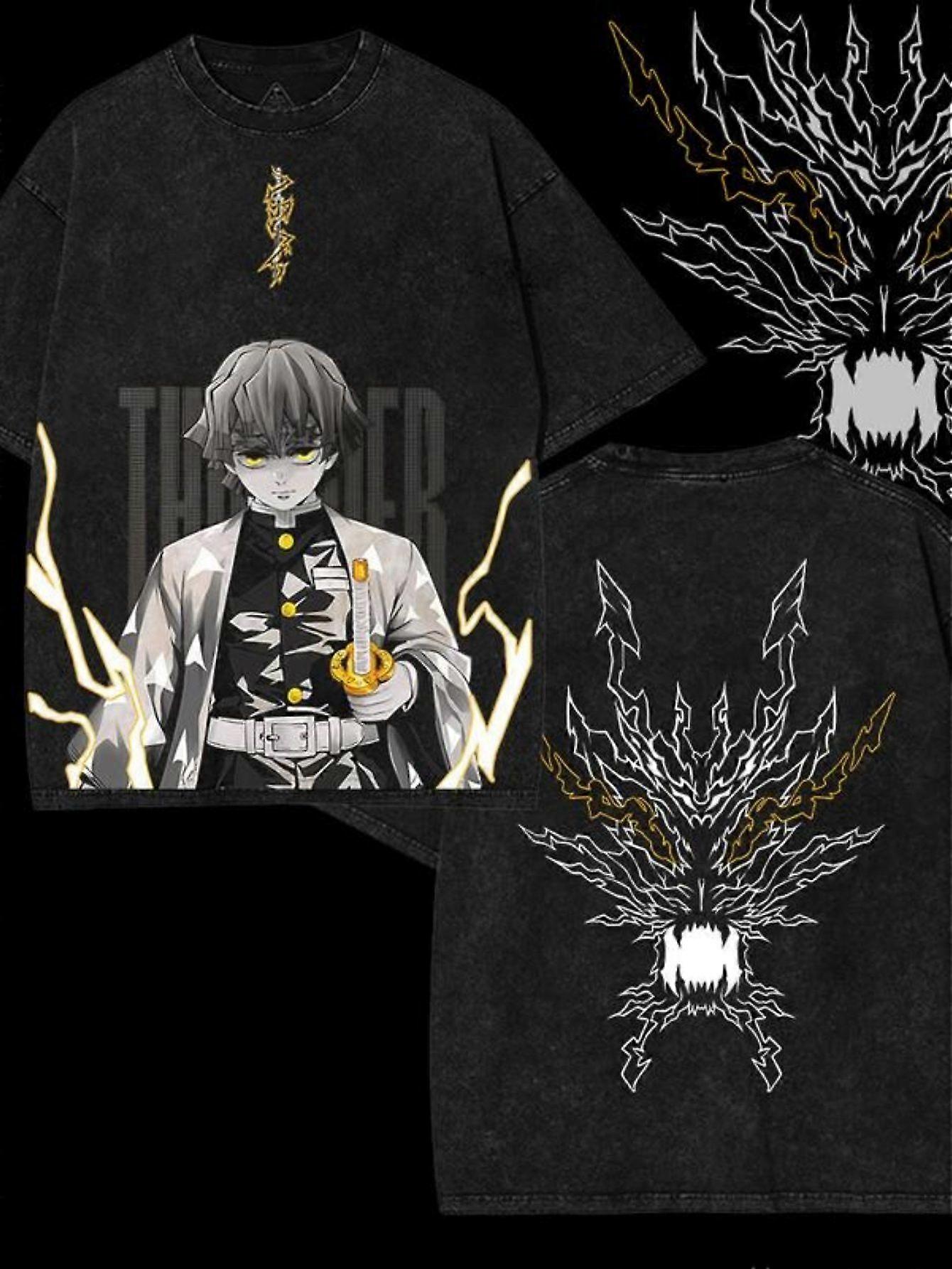 Men'S Anime Graphic T-Shirt - Double-Sided Washed Cotton Tee with Lightning Bolt Design, Black & Golden Streetwear Shirt-Almwy