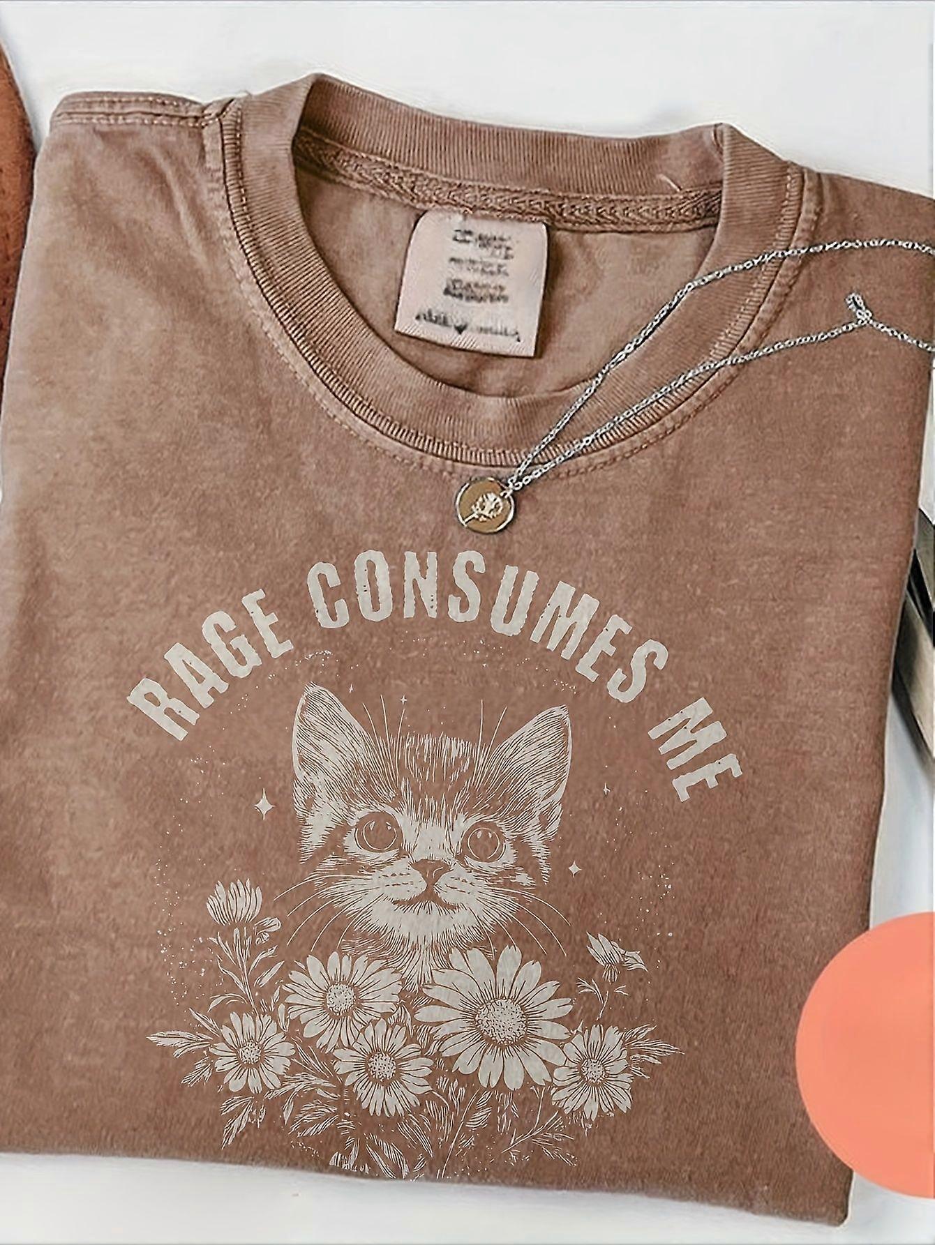 Limited Edition Black Cotton Washed T-Shirt with "Rage Consumes Me" Graphic & Cat Floral Print - Regular Fit Streetwear -Almwy