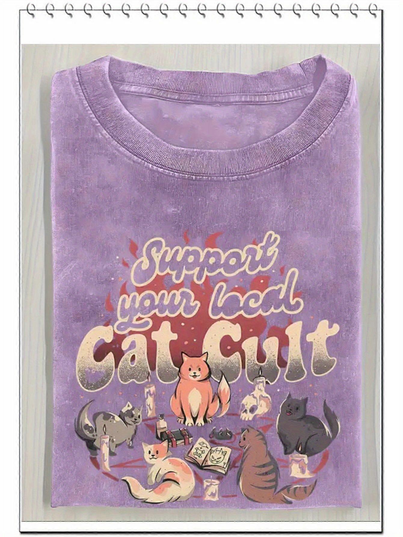Support Your Local Cat Cult Purple Washed Cotton T-Shirt \u2013 Fun Graphic Print, Soft & Comfortable Round Neck Tee for-Axsgh