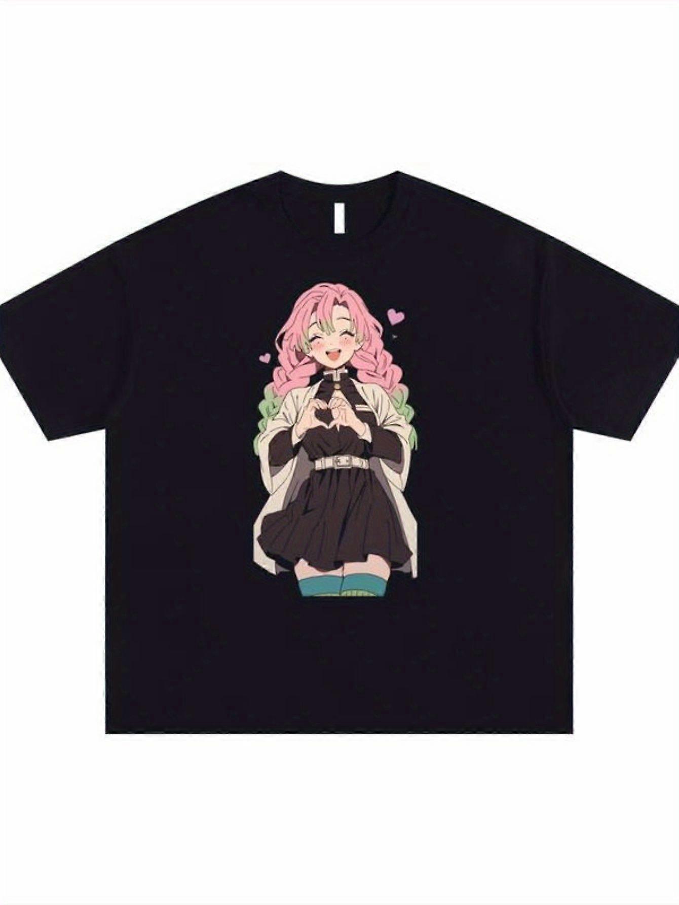 Men'S Anime Graphic T-Shirt - Cute Girl with Pink Hair & Hearts Print - Black Tee - Lightweight Breathable Cotton Shirt -Axsgh