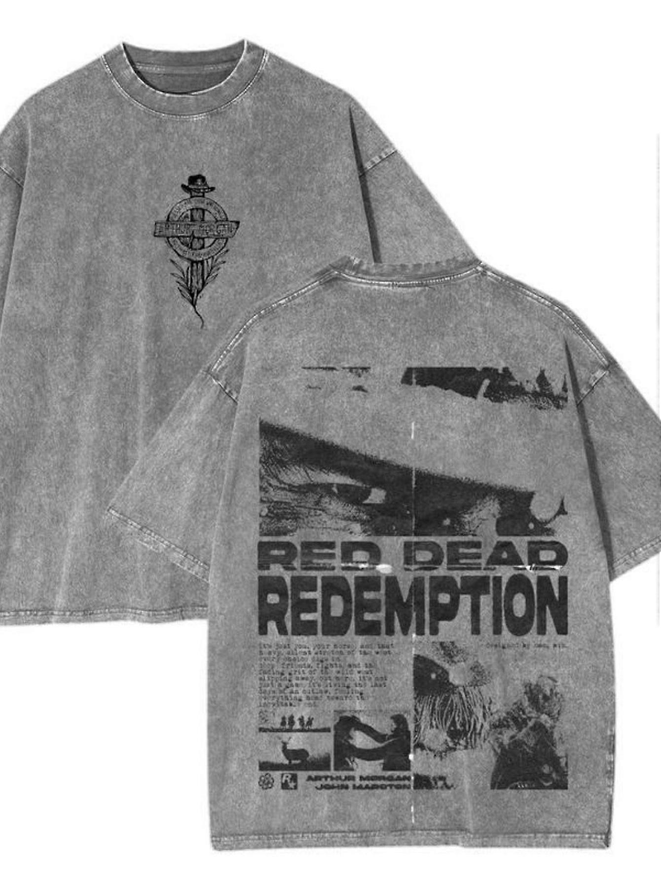 Men'S Heavyweight Vintage Washed T-Shirt - Survival Gaming Graphic Tee with Red Deademption Design, Double-Sided Retro S-Aqjnf
