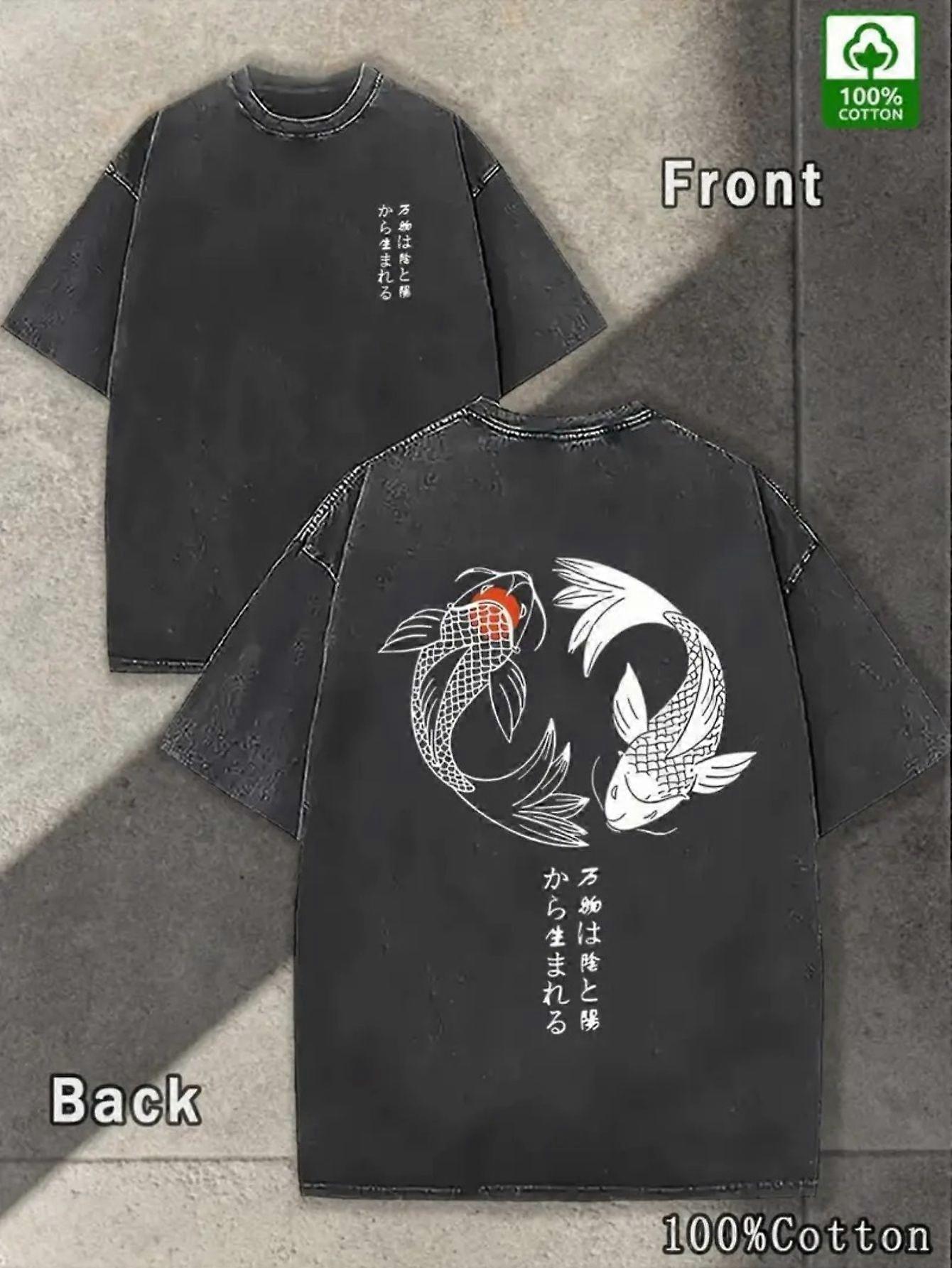 Men's Vintage Washed Cotton T-Shirt - Black Tee with Dual-Sided Koi Fish Print (Front/Back), Japanese Good Luck Design --Aqjnf