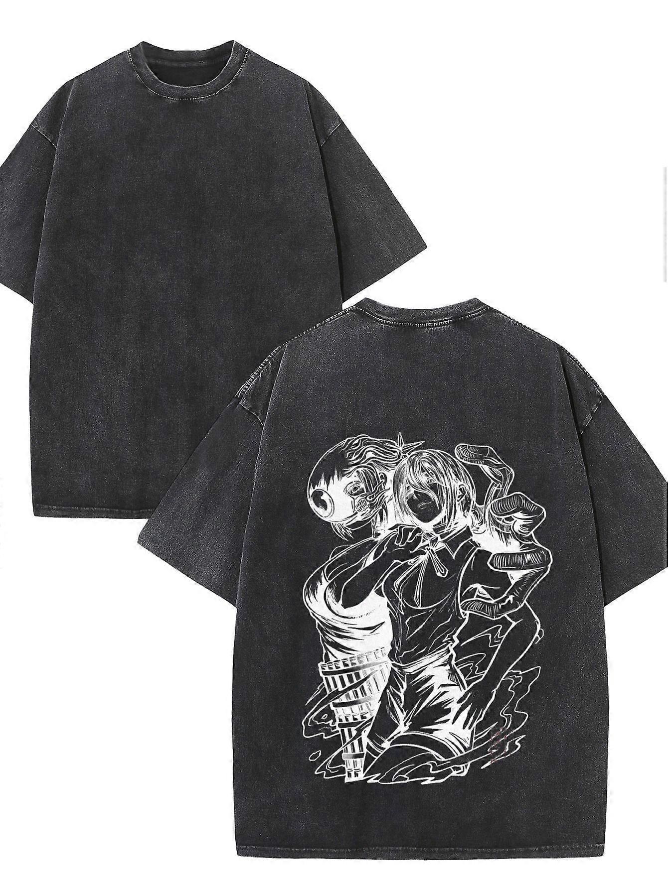 Anime Water Washed Pure Cotton T-Shirt with Dynamic Fighting Scene Print - Stylish and Comfortable for Casual Wear, Idea-Aqjnf