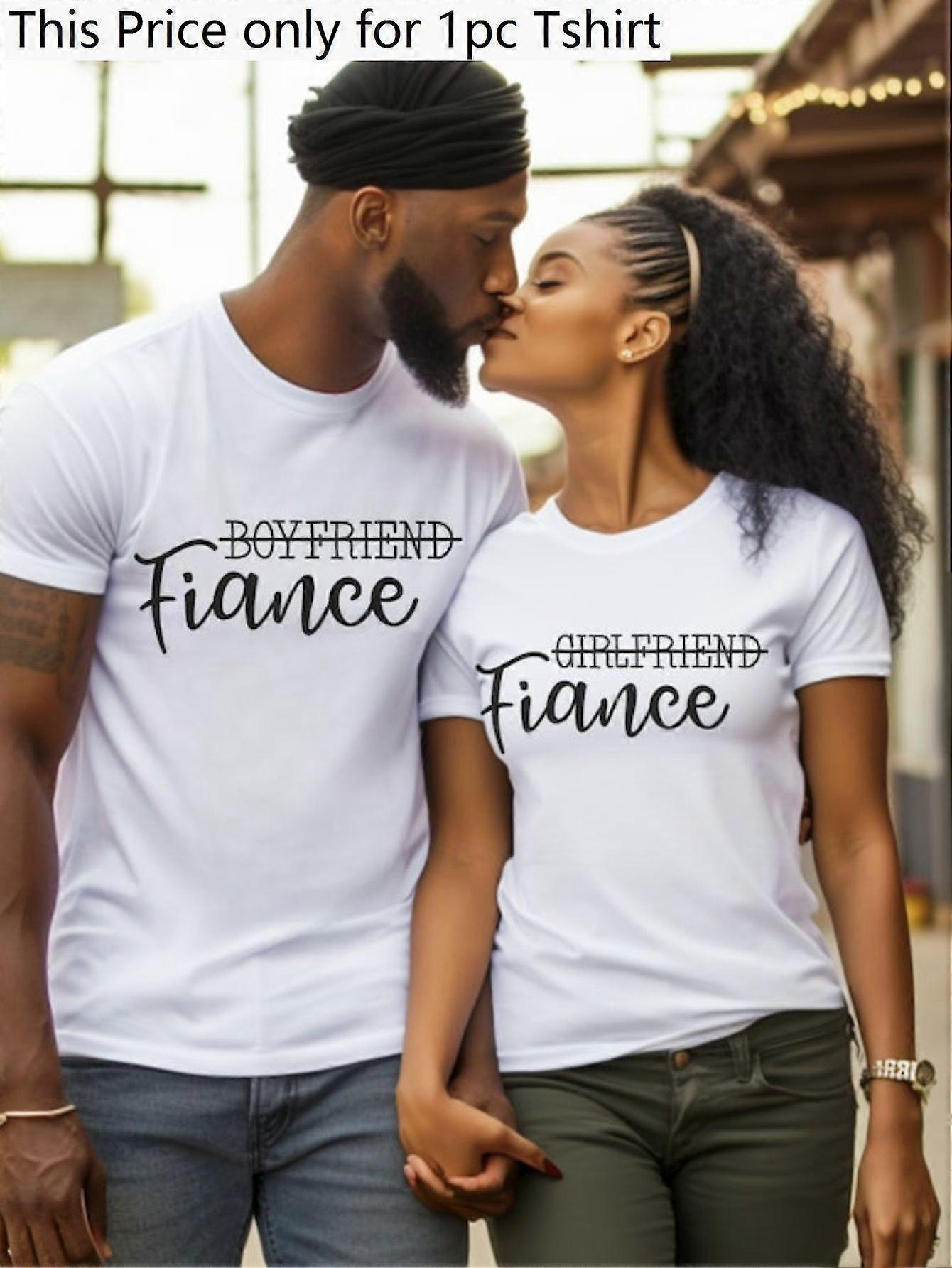 1pc Matching Couples Valentine Day Shirt - "BOYFRIEND Fiance" & "GIRLFRIEND Fiance" Printed White Cotton T-Shirt, Short -ZXCVB