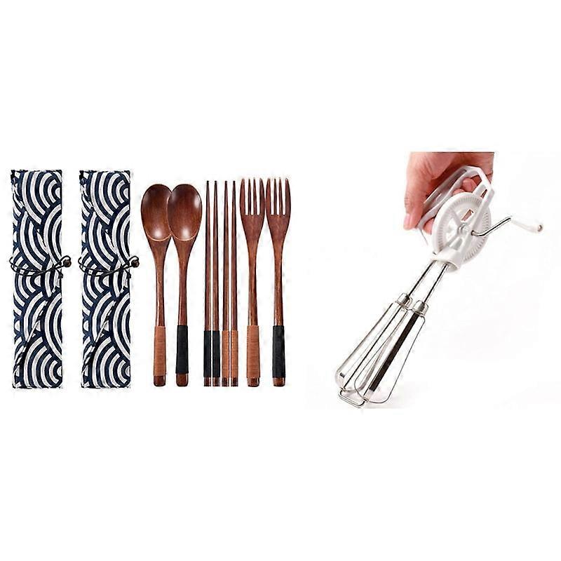 Rotary Manual Hand Whisk Egg Beater Mixer Blender Stainless Steel with 2 Set Wooden Flatware Tableware Cutlery Set