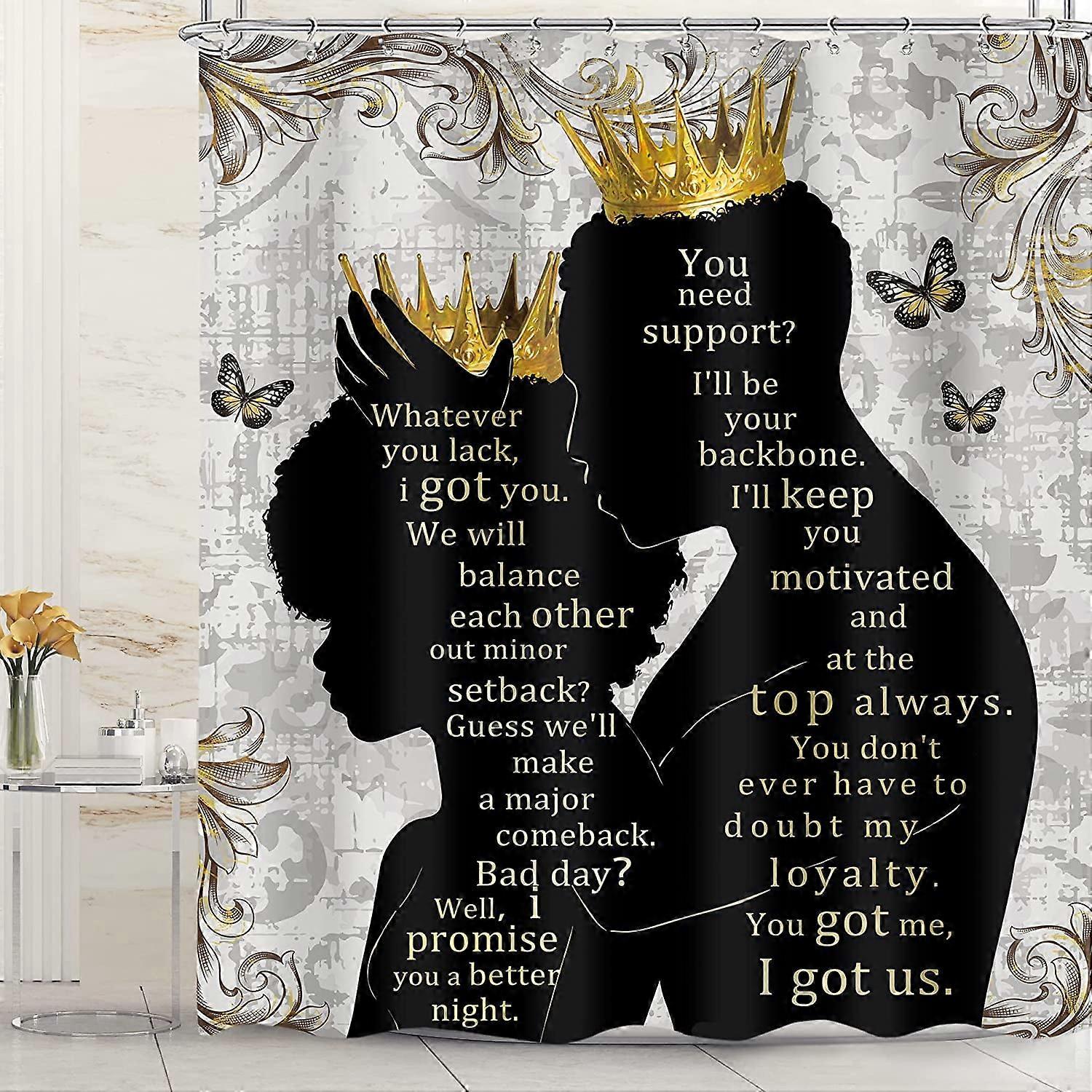 African American Women Men Shower Curtain 60x72 Inch with Afro Queen King Crown, Butterfly & Inspirational Quotes, Waterproof Fabric with 12 Hooks