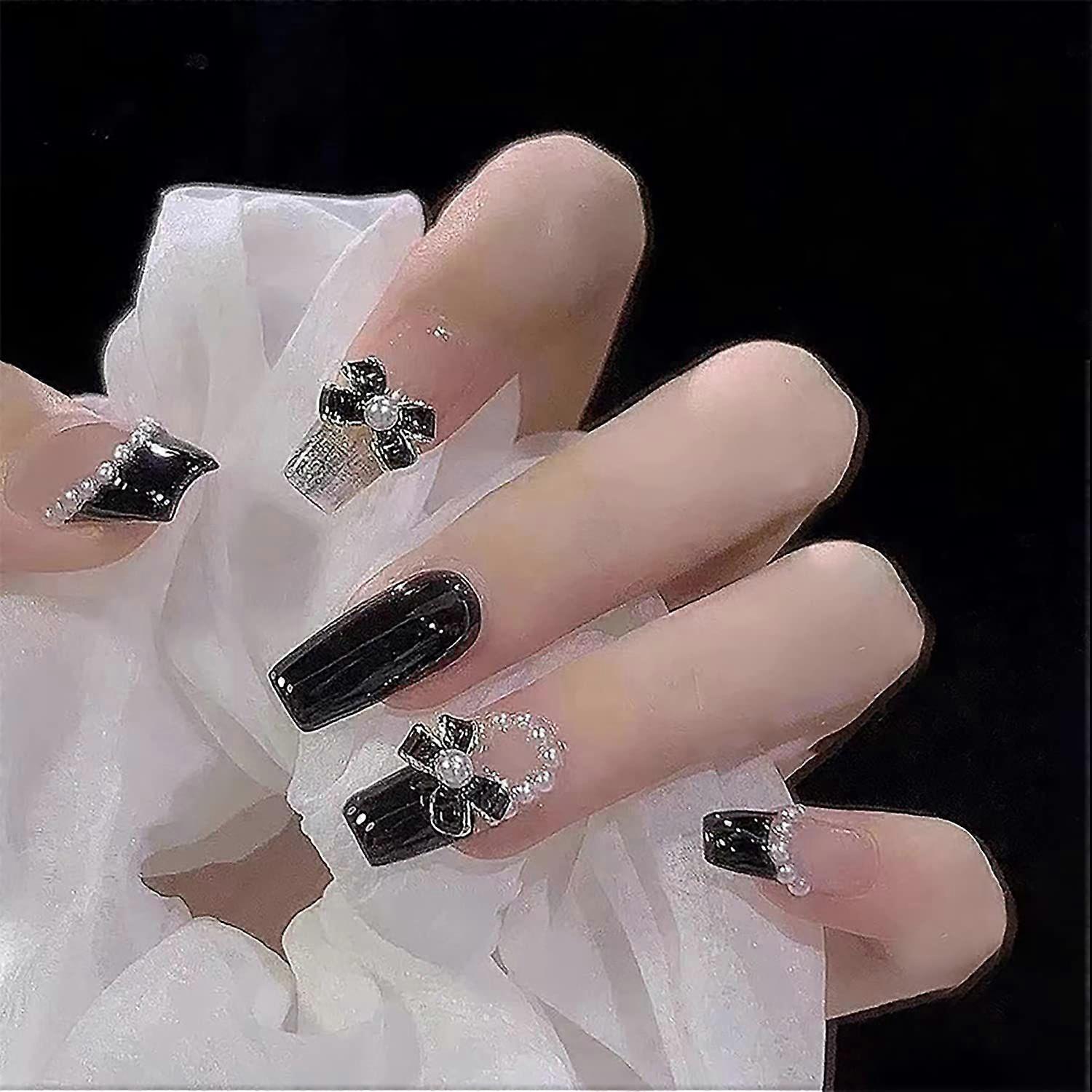SeraphinaT 24Pcs Artificial Acrylic Fake Nails with Black Bow Pearl Designs,
