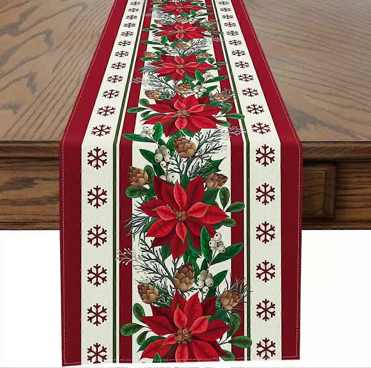 Christmas Table Runner 183 x 33 cm Linen Red Flower Snowflake Design for Winter Xmas Holidays Kitchen and Dining