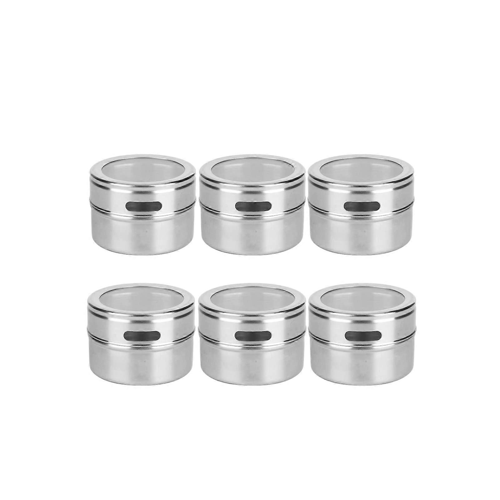 A set of six magnetic spice jars. Each jar measures 2.4 x 2.4 x 1.7 inches. The lids keep the contents dry and clean, and the stainless steel base can be fixed where you want. Material and durability Made from foodgrade stainless steel and PP material. Reusable, strong and durable, with a long service life. Easy to use Transparent lids let you quickly identify the contents. The dispensing outlet is designed with fine mesh holes to store salt, sugar, chili powder, and other condiments. Travel friendly and practical Magnetic and sticks to any flat metal surface, including most appliances or refrigerator doors. The rotating design of the inverted hole allows controlled dispensing; the small dispensing hole helps you add spices to your food precisely. Use scenarios In a home kitchen, attach to the refrigerator door or metal backsplash for fast access during cooking. In an RV, hotel kitchenette, or office break room, mount on metal surfaces for convenient seasoning on the go. On a stainless steel island, range hood, or appliance, keep spices within arm's reach while you prepare meals.