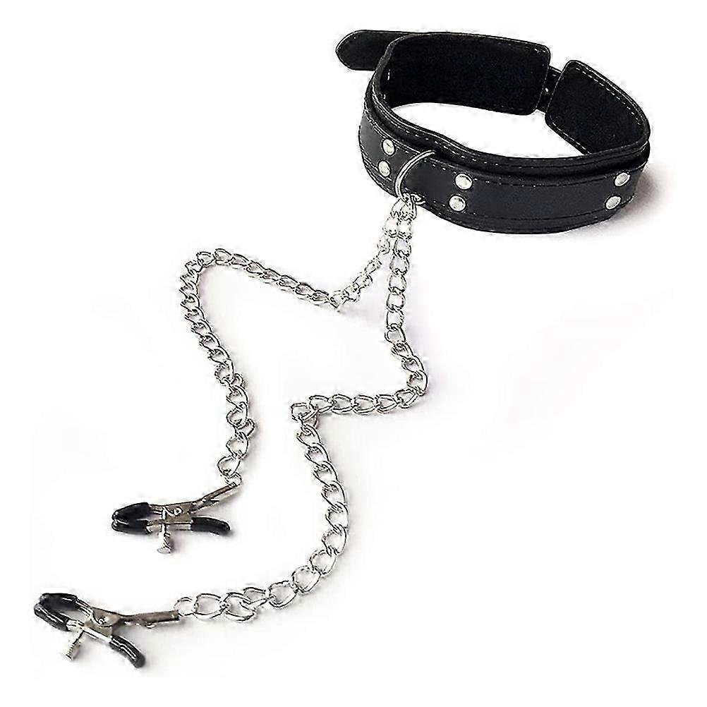 Leather Nipple Clips with Metal Chain Collar for Adults