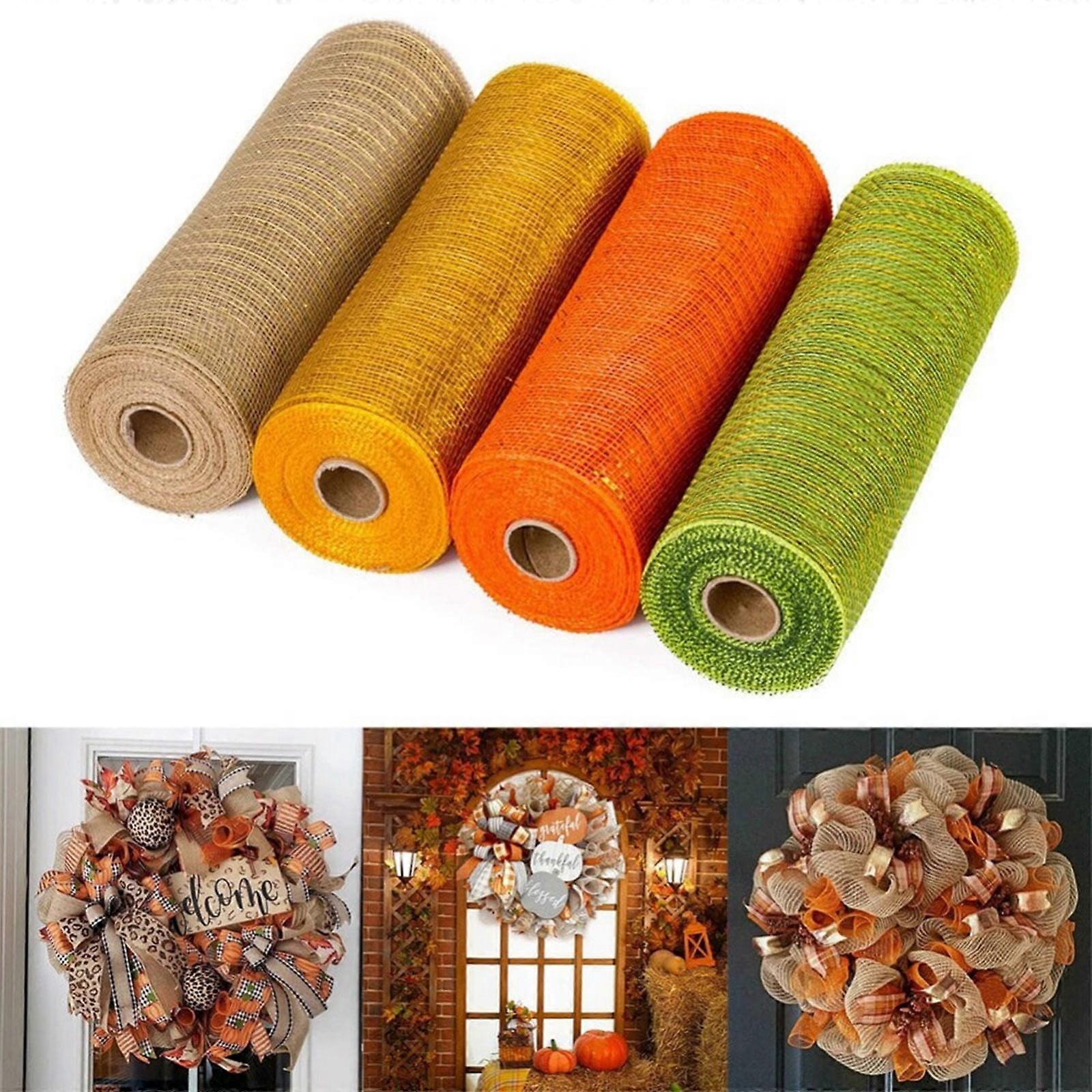 4 Rolls 10" Brown/Orange/Yellow/Green Decorative Mesh Ribbon, compatible with Wreath Supplies, Front Door Wreath, Craft Tree, Fall, Thanksgiving,