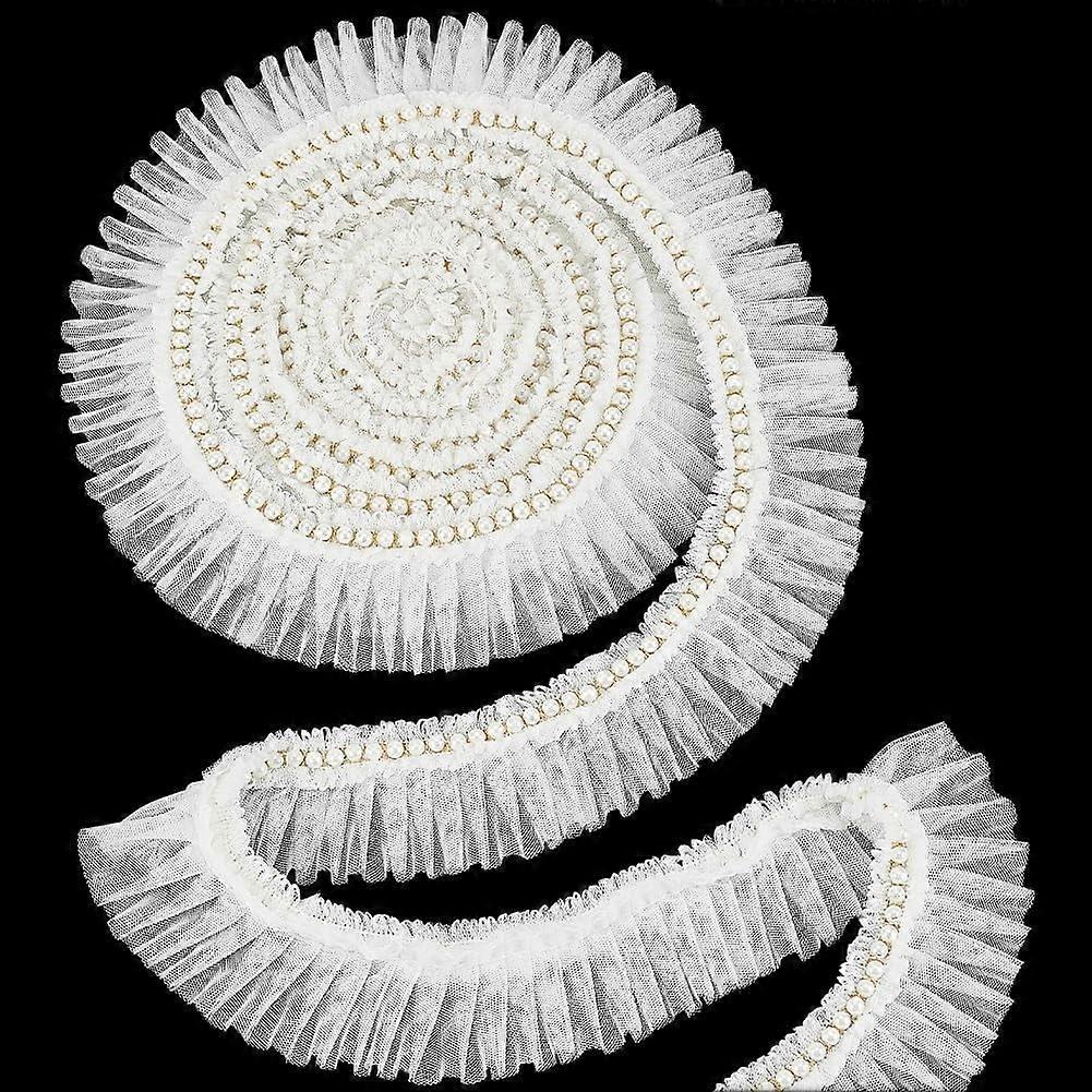 4 Yards Ruffle Trim Ribbon 2-3/8 inch Wide White Pleated Tulle Lace Trim with Pearl Beads Decorative Pleated Lace Ribbon for Sewing Clothes Accessories for Wedding Clothes Decor Package & Size: The package you will receive contains a beautiful lace ribbon which is about 2-3/8 inch(60mm) wide 0.43inch/11mm thick and 4 yards(3.66m) long which is enough for you to use in daily life. Ruffle Trim Ribbon: The delicate pleated tulle lace trim is in white color and our ribbon has a unique pleated design. There are a lot of plastic pearl beads on the side of lace as beautiful decoration. You can use the ribbon to make great decorations for your clothes. Quality Material: Our pleated lace trim is made of high quality polyester with a lot of beautiful plastic pearl beads and the ribbon is washable reusable durable strong and not easy to tear or loose. And the beautiful trim has good workmanship and pretty appearance so that it will be ideal decorations for you. Easy to Use: The delicate lace ribbon can be cut to any length according to your own preference. And you can prepare the thread and needle to sew it on your clothes as an elegant decoration. You will enjoy the fun of DIY. Wide Application: The lace ribbon trim is perfect for you to make DIY handwork projects at home. The ribbon is suitable for brides dress bridal headpiece clothes costume bags hats handcrafts pet clothes parties festivals wedding decoration.