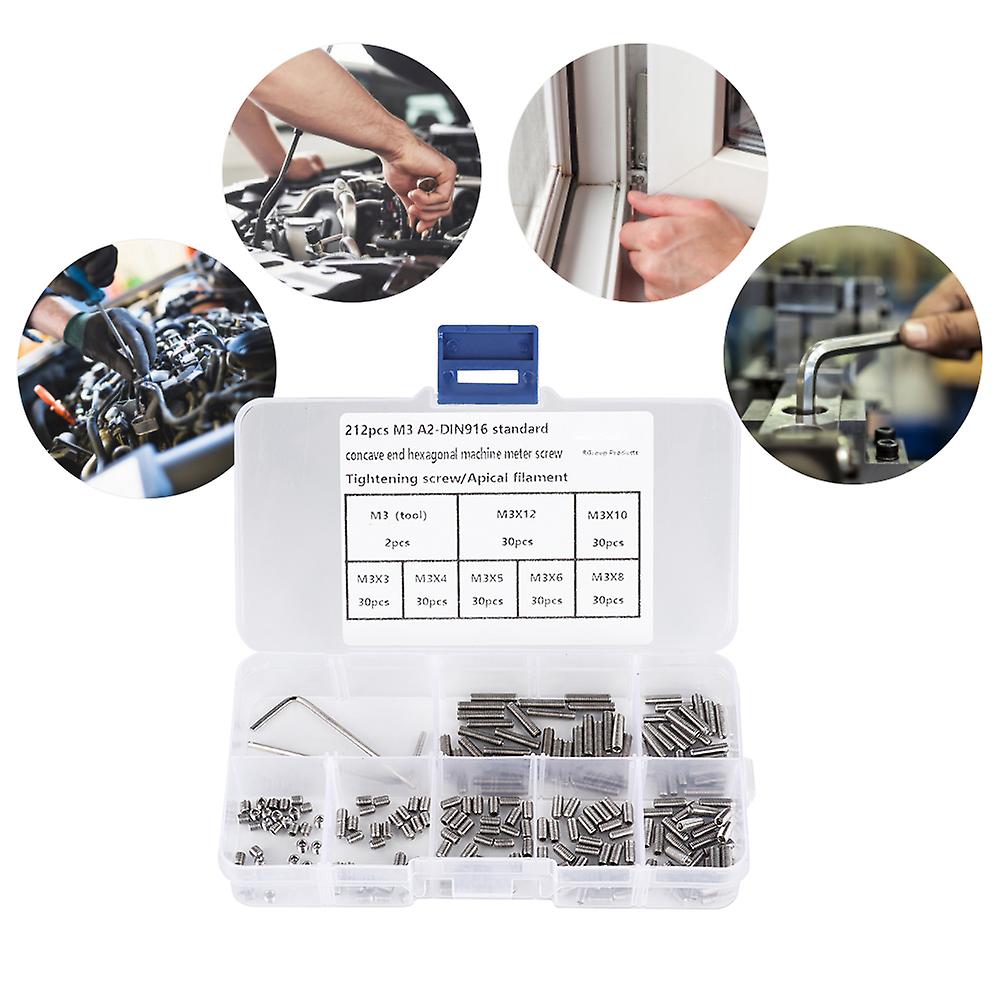 212Pcs Grub Screws Stainless Steel M3 A2-DIN916 Inner Hex Concave End Tighten Screw Headless Features: 1. Made of 304 stainless steel material, durable and long service life. 2. Perfect replacement for the old or damaged one. 3. Including different standard set screws, easy to operate. 4. This is a DIY kits with installation tools for quick and easy using. 5. There is a storage box which it is convenient to carry.   Specification: Condition: Item Type: Set Screw Material: 304 Stainless Steel   Package List: 30 x M3x3 Set Screw 30 x M3x4 Set Screw 30 x M3x5 Set Screw 30 x M3x6 Set Screw 30 x M3x8 Set Screw 30 x M3x10 Set Screw 30 x M3x12 Set Screw 2 x M3 Installing Tools