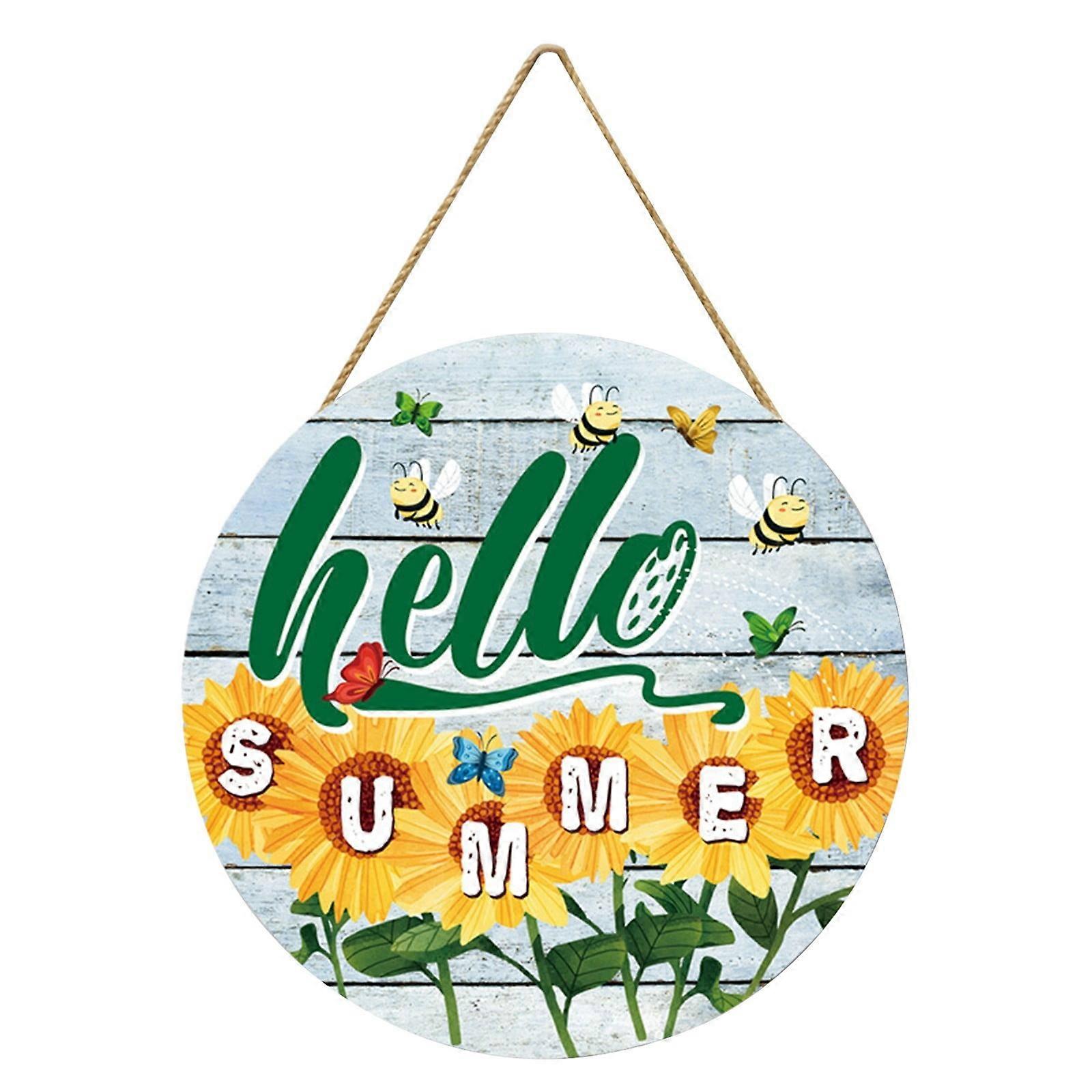 Hello Summer Round Wooden Board Painting Living Room Porch Wall Decoration Summer Sunflower Beeroom Door Pendant Home Essentials