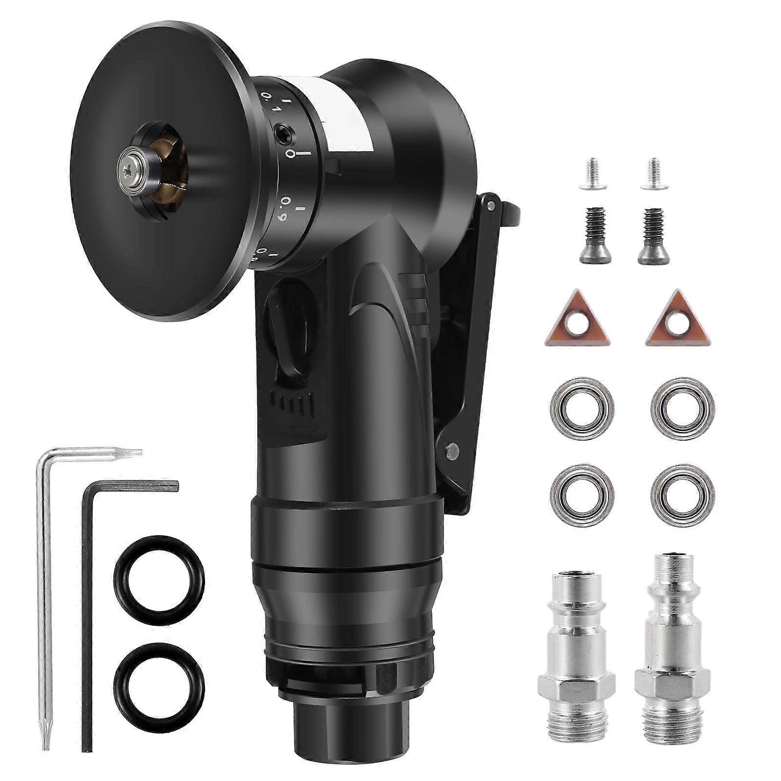 Parts List: 01: 1 x Pneumatic Chamfering Machine 2 x Bearing Fixing Screw 4 x Blade Fixing Screw 8 x C Angle Blade 4 x Bearing 1 x European Standard Connector 1 x American Standard Connector 2 x Wrenches 2 x Seals OR 02: 1 x Pneumatic Chamfering Machine 2 x Bearing Fixing Screws 2 x Blade Fixing Screws 2 x C Angle Blade 4 x Bearing 1 x European Standard Connector 1 x American Standard Connector 2 x Wrenches 2 x Seals Highlight description: [Speed Adjustable] Mini deburring trimming chamfering tool features air grinder 1-5 block valve adjustment thickened knob, can adjust the gear speed freely. Chamfering size can be adjusted at will [Lightweight and Handheld] This 45 degree pneumatic mini chamfering machine air tool is lightweight, small and delicate, easy to operate with one hand. You can easily adjust the chamfering size and change the blade by using the matching wrench [C Angle Blades] C angle blades are angled and are mainly used for metal chamfering. Ensure smoother and more enduring chamfering [Safety Switch] Handheld pneumatic chamfering tool with 1/4 inch metal filter, free speed: 30,000 rpm, air consumption 0.4/min, safety switch to prevent accidental contact and protect the user at all times [Multi-Purpose] This pneumatic chamfering machine has a wide range of applications and can chamfer C angles, round holes, irregular edges, arcs and straight edges on a wide variety of materials such as steel, aluminium, copper, acrylic and wood Detailed description: Description The pneumatic chamfering machine adopts a new lightweight design and can be easily operated with one hand. The chamfering size can be adjusted freely. The speed of the gear can be freely adjusted and it is widely used for chamfering a wide range of materials such as metal and wood. Key Features Safe to Use: The safety switch prevents accidental contact and protects the user's safety at all times. Easy to Operate: This mini pneumatic chamfering machine is lightweight and easy to operate with one hand for quick deburring. Specification Product name: Pneumatic Chamfering Tool Material: plastic steel Size: 15 x 5.8cm Disc surface: 4.8cm Body diameter: 3.2cm Connector: about 4cm Free Speed: 30000RPM Air consumption: 0.4/min Air inlet: 1/4 inch PT Edge cutting capacity: Chamfer: C0-C2. 0 Adjustable depth: 0.1mm-0.9mm Chamfering: R0-R1.5 (need to provide your own blade) Chamfering hole diameter: ≥8mm Color: black Style(optional): 8C+4 bearings, 2C+4 bearings Notes: 1.There may be slight differences between the picture and the actual color of the commodity. We will try our best to show you the exact color. 2.Please allow slight dimension difference due to manual measurement. [Speed Adjustable] Mini deburring trimming chamfering tool features air grinder 1-5 block valve adjustment thickened knob, can adjust the gear speed freely. Chamfering size can be adjusted at will [Lightweight and Handheld] This 45 degree pneumatic mini chamfering machine air tool is lightweight, small and delicate, easy to operate with one hand. You can easily adjust the chamfering size and change the blade by using the matching wrench [C Angle Blades] C angle blades are angled and are mainly used for metal chamfering. Ensure smoother and more enduring chamfering [Safety Switch] Handheld pneumatic chamfering tool with 1/4 inch metal filter, free speed: 30,000 rpm, air consumption 0.4/min, safety switch to prevent accidental contact and protect the user at all times [Multi-Purpose] This pneumatic chamfering machine has a wide range of applications and can chamfer C angles, round holes, irregular edges, arcs and straight edges on a wide variety of materials such as steel, aluminium, copper, acrylic and wood