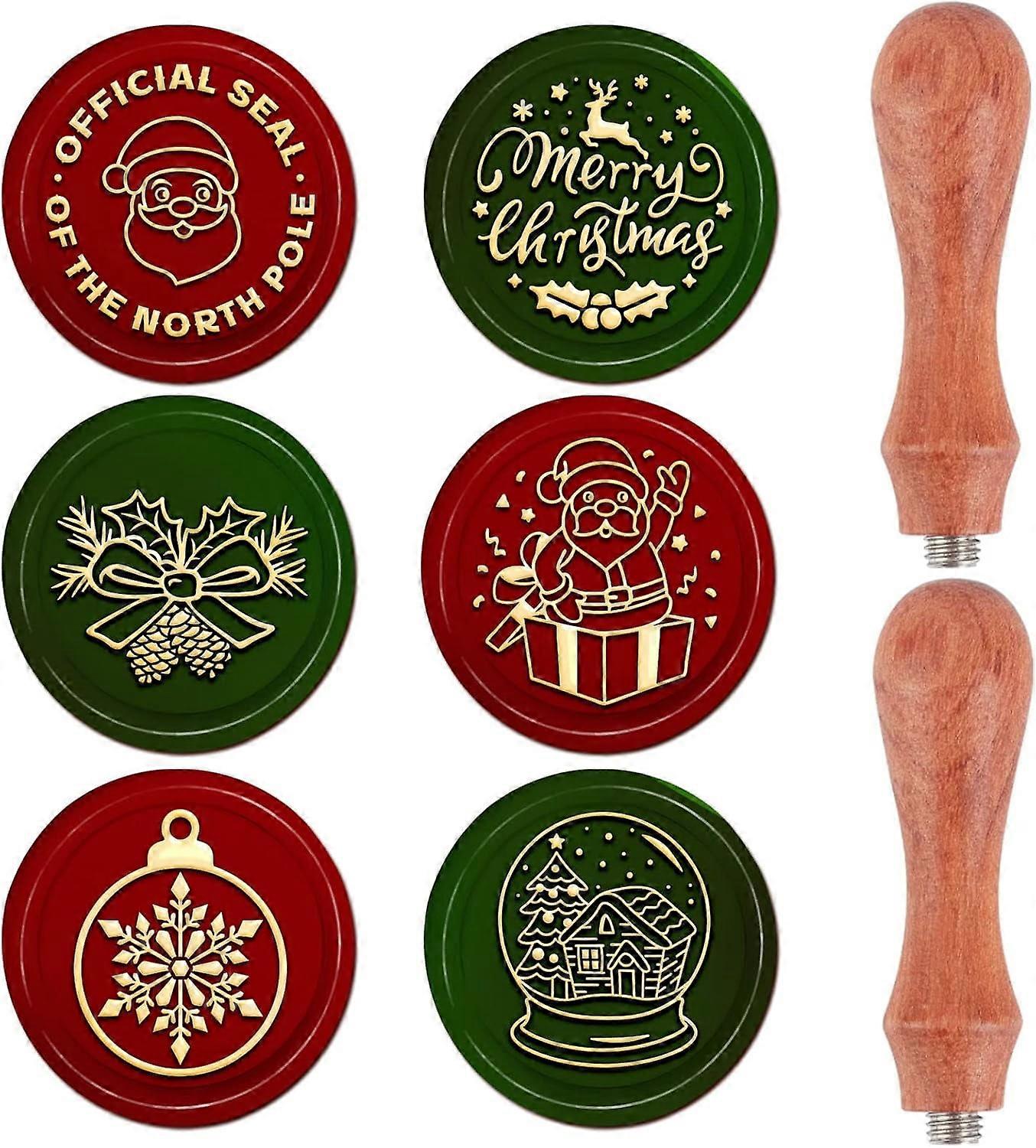 Christmas Wax Seal Stamp Set 6pcs Vintage Brass Heads with 2 Wood Handles, compatible with Acorn Snow Santa Snowflakes Elk, DIY Wedding Invitations