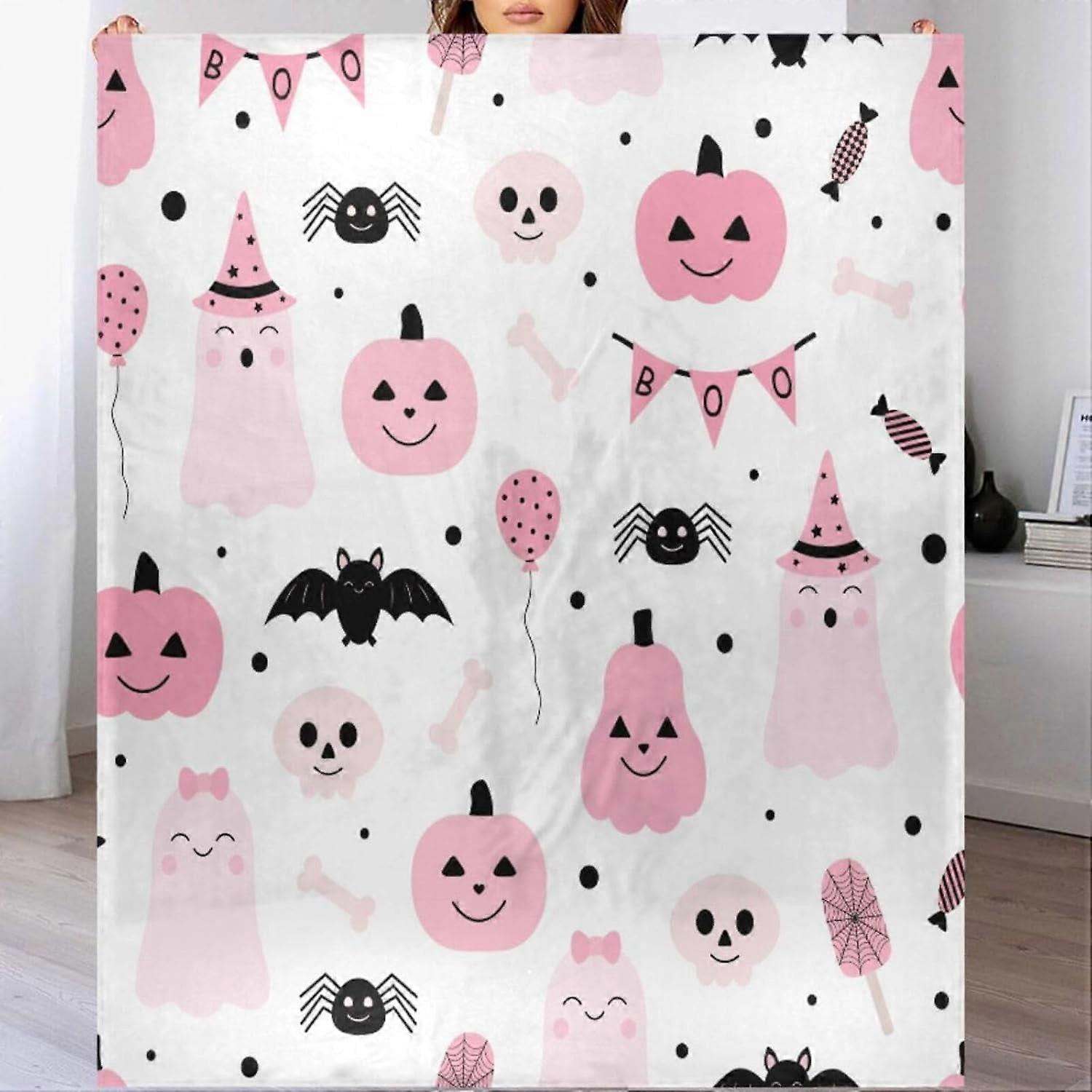 Pumpkin Halloween Throw Blanket 50x60" Soft Cozy Flannel Fleece with Kawaii Pink Ghosts, Lightweight Warm Fuzzy Blanket for Couch, Bed, Chair