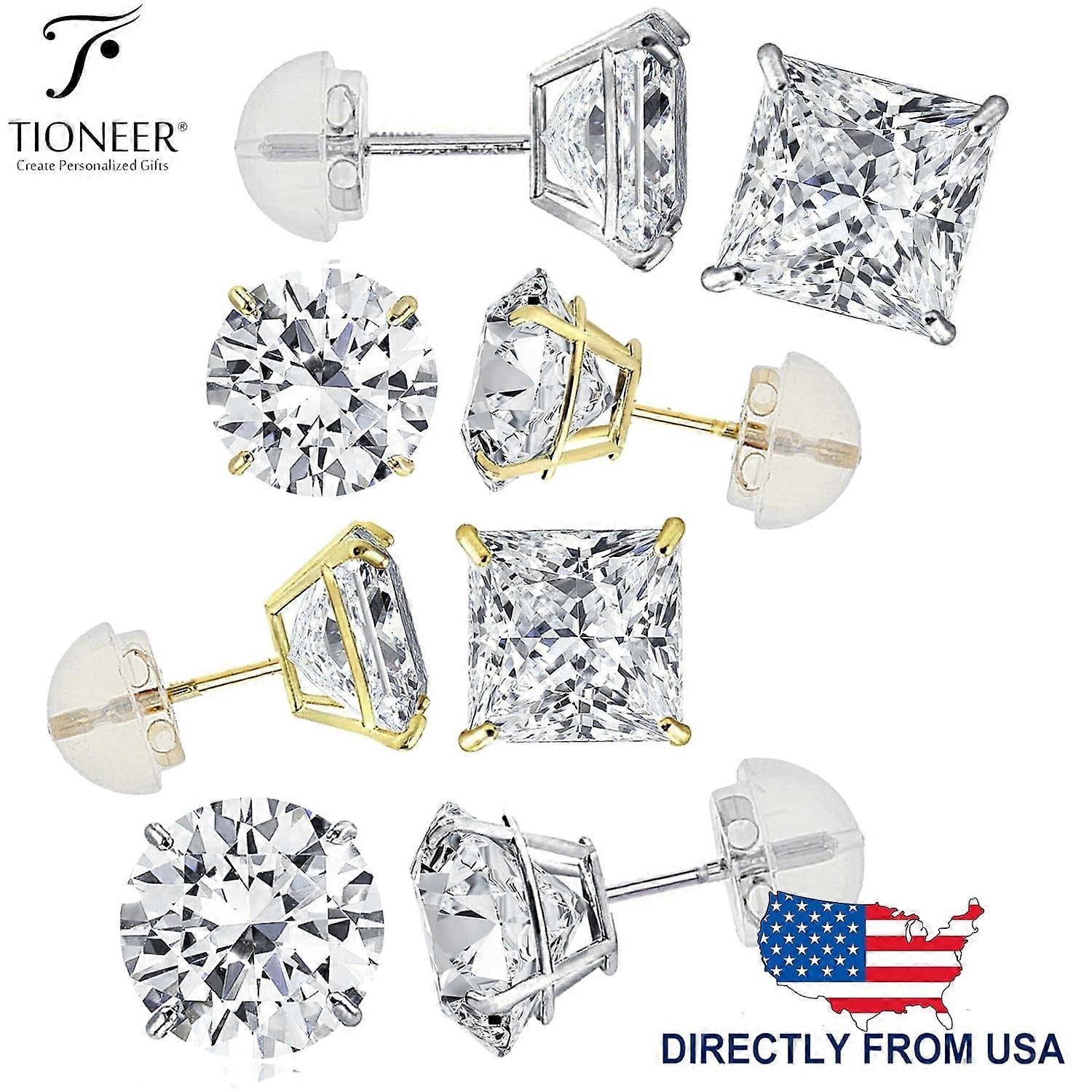 Tioneer 14K White or Yellow Gold Princess Solitaire Square CZ Silicon Push Back Ear Stud Earring