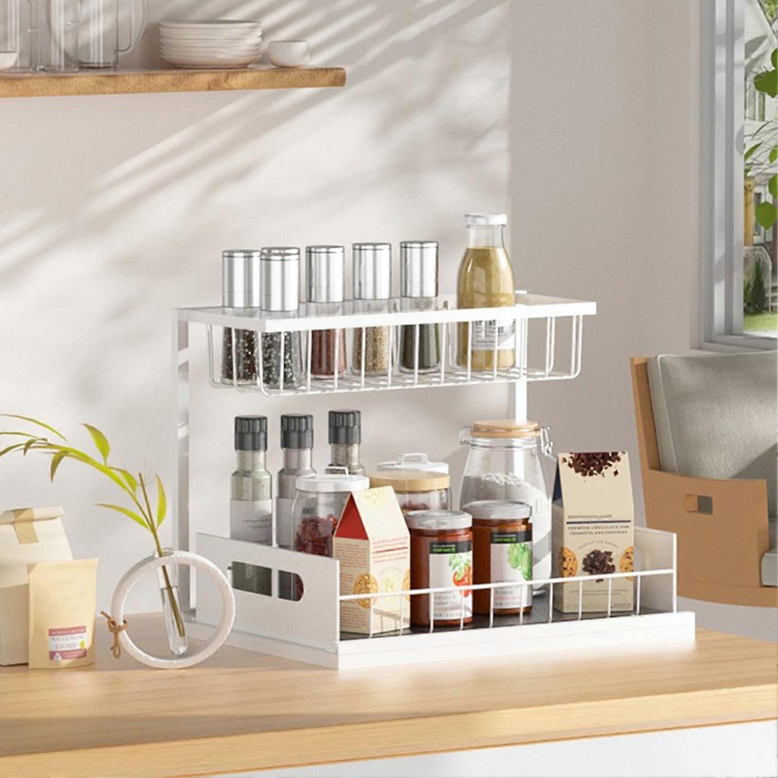 SUSUchens Kitchen Storage Rack Multi-Use Two-tier High Fence under Sink Organizer Bathroom Pull Out Cabinet Seasoning Jars Storage Shelf White