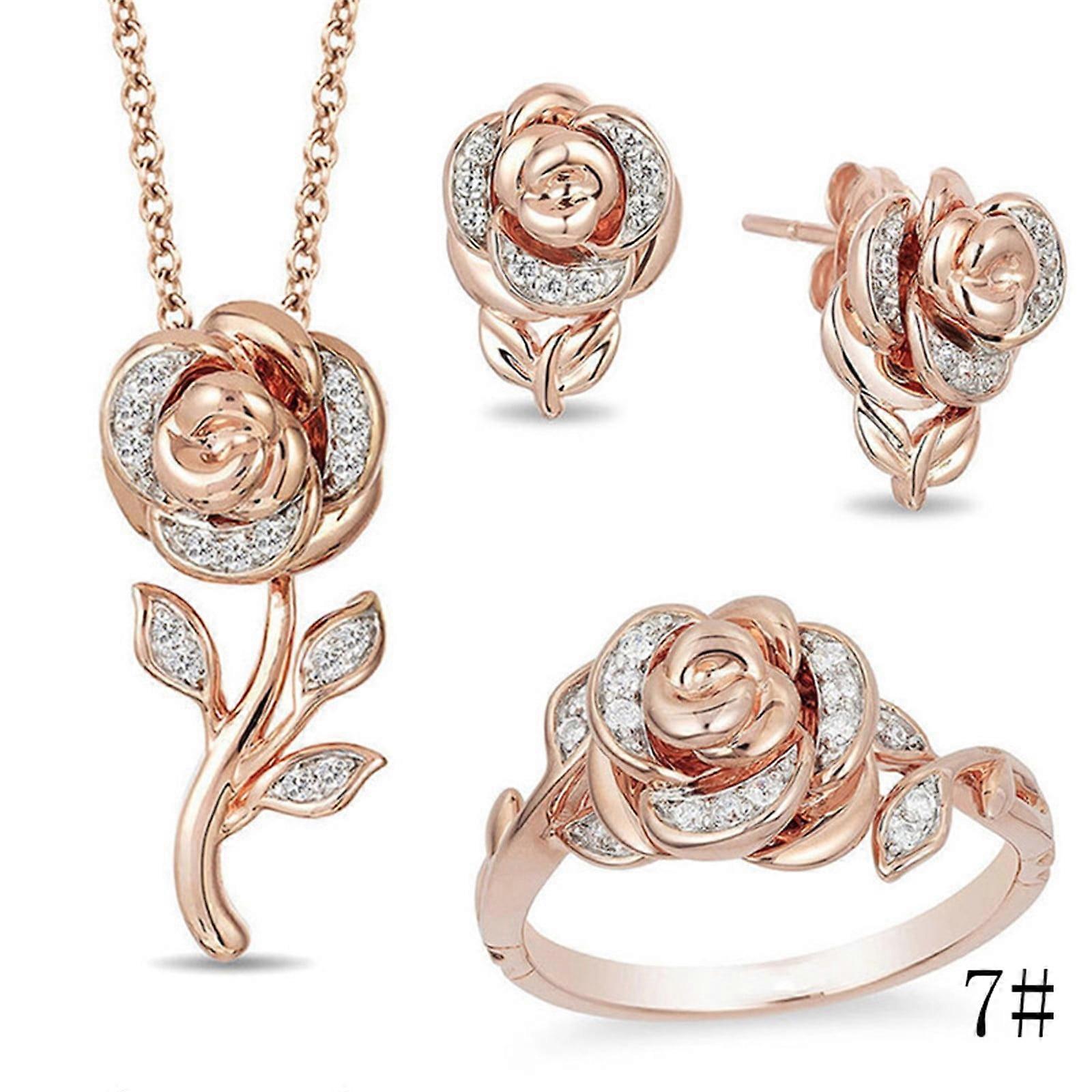 Fashion Rose Crystal Jewelry Set for Women, Earring Pendant Necklace Ring, Rose Gold, Size 7, Valentine's Day Gift