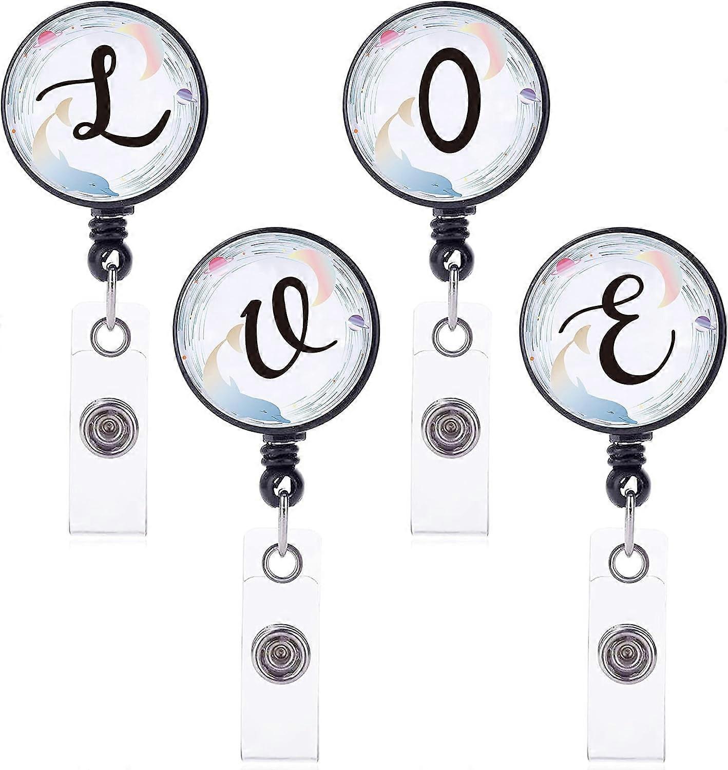 4Pcs Retractable Badge Reel Clip ID Badge Holder 360° Swivel Badge Reels with Alligator Clip on ID Card Holders for Office Worker Doctor Nurse - L O V E Words Design Size: 85x17mm/3.35x0.67inch, 1pc/style Material: Plastic Shape: Letter Usage: Badge Holders Package Size: 1 Box per package