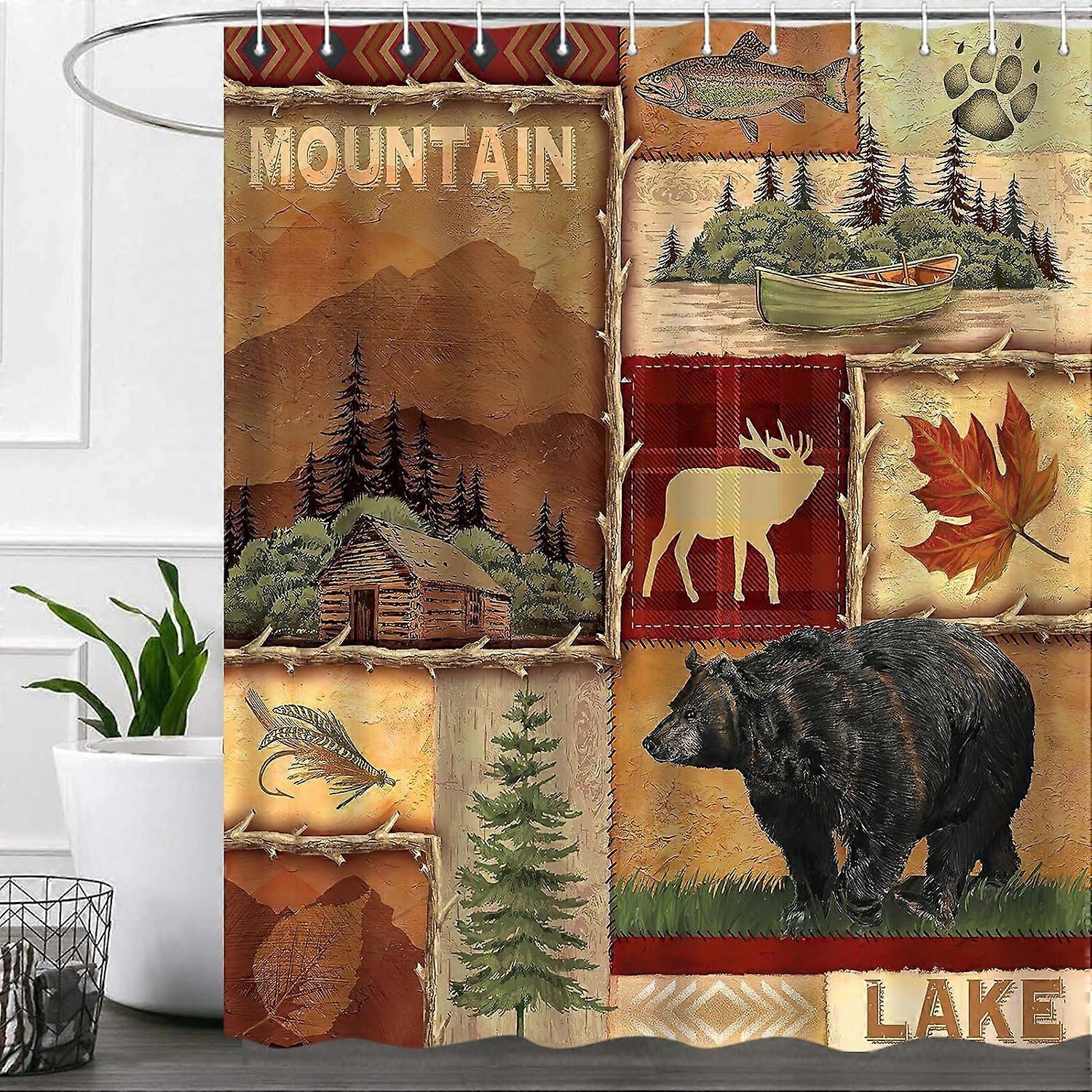 Rustic Bear Shower Curtain Set 60x72 Inches, Lake Country Lodge Cabin Moose Fabric RV Bathroom Decor with Hooks
