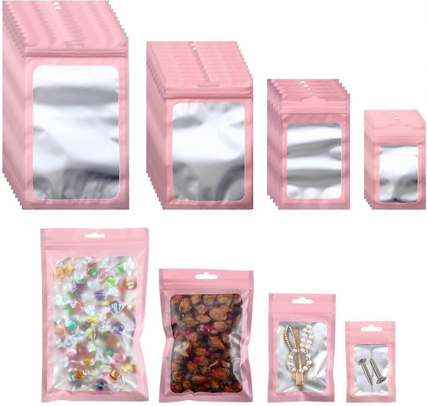 120 Pcs Resealable Foil Pouch with Window, Euro Hole, Odorless Mylar Bags, Food Safe, Airtight Ziplock, 4 Sizes (Matte Pink)