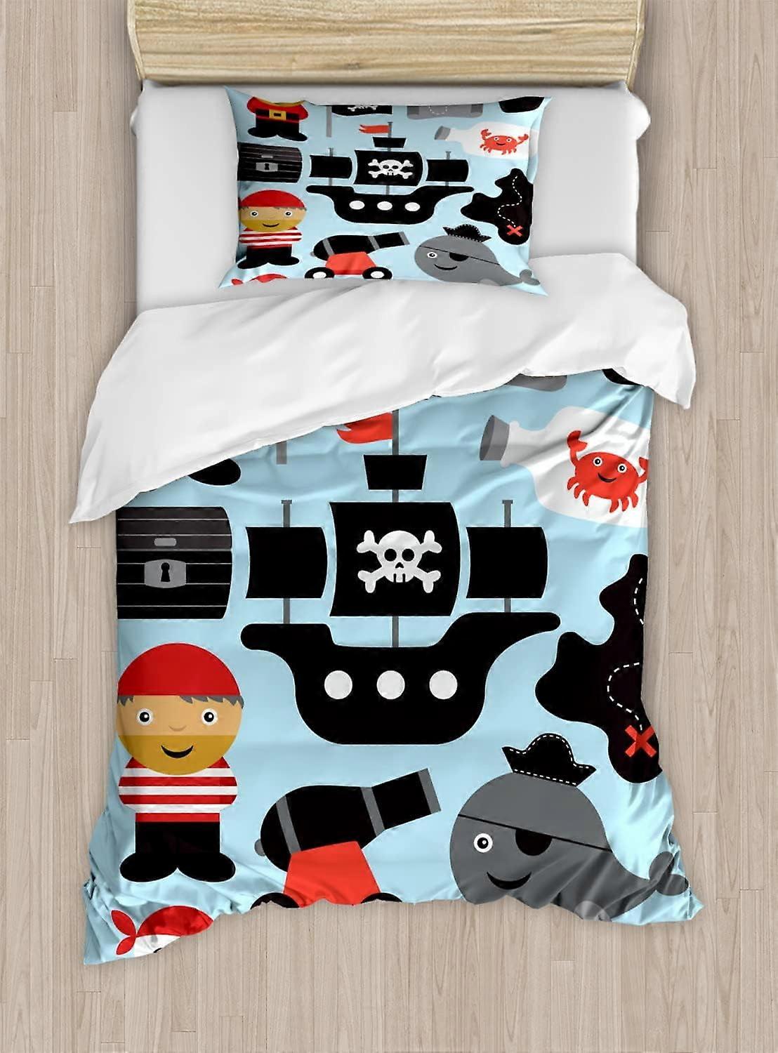 Pirate Duvet Cover Set, Ahoy Pirate Theme Nautical Hat Flag Bottle Ship Toy Island Skull, Decorative 3 Pcs Bedding Set with 2 Pillowcases, Navy Blue
