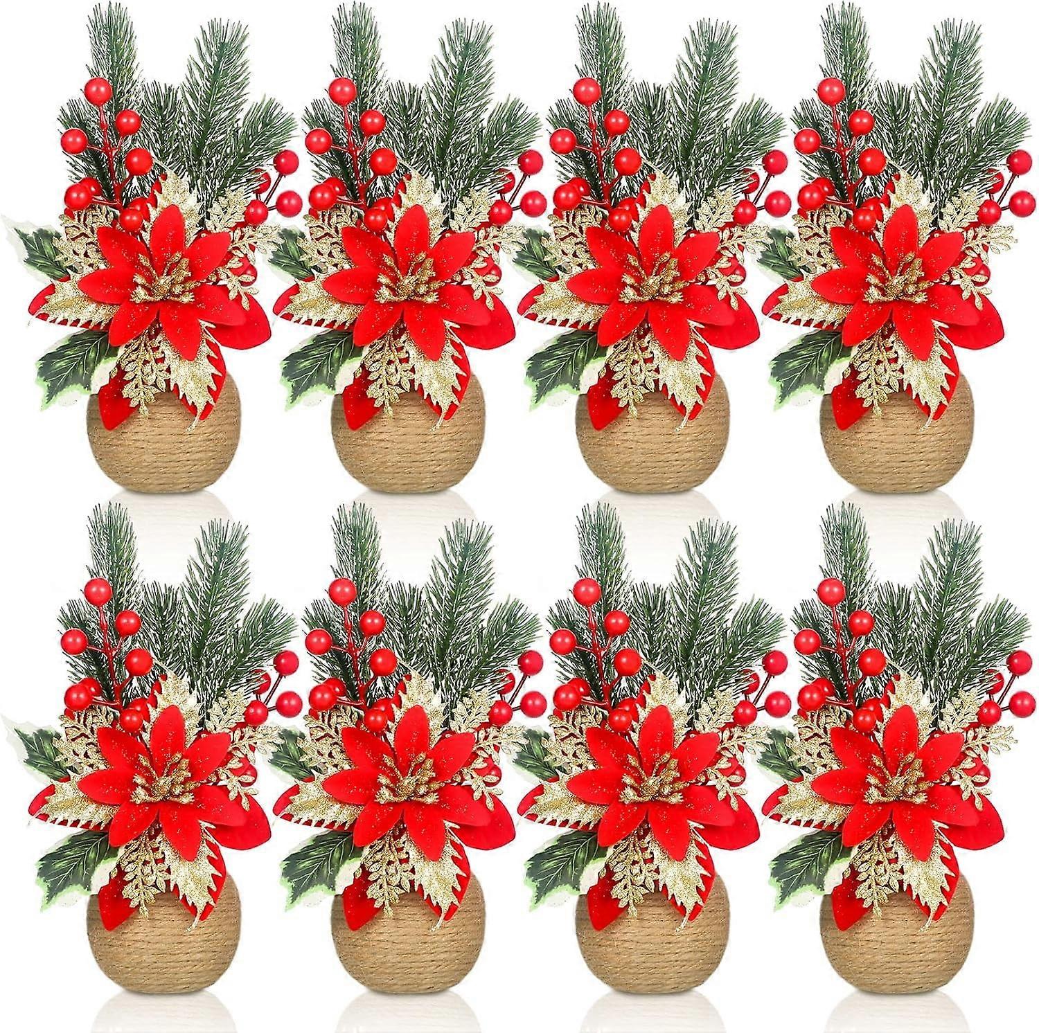 8 Pcs Christmas Poinsettias Artificial Flowers with Pinecones & Holly Berries, Red & Green Silk Floral Arrangements for Holiday Home Decor