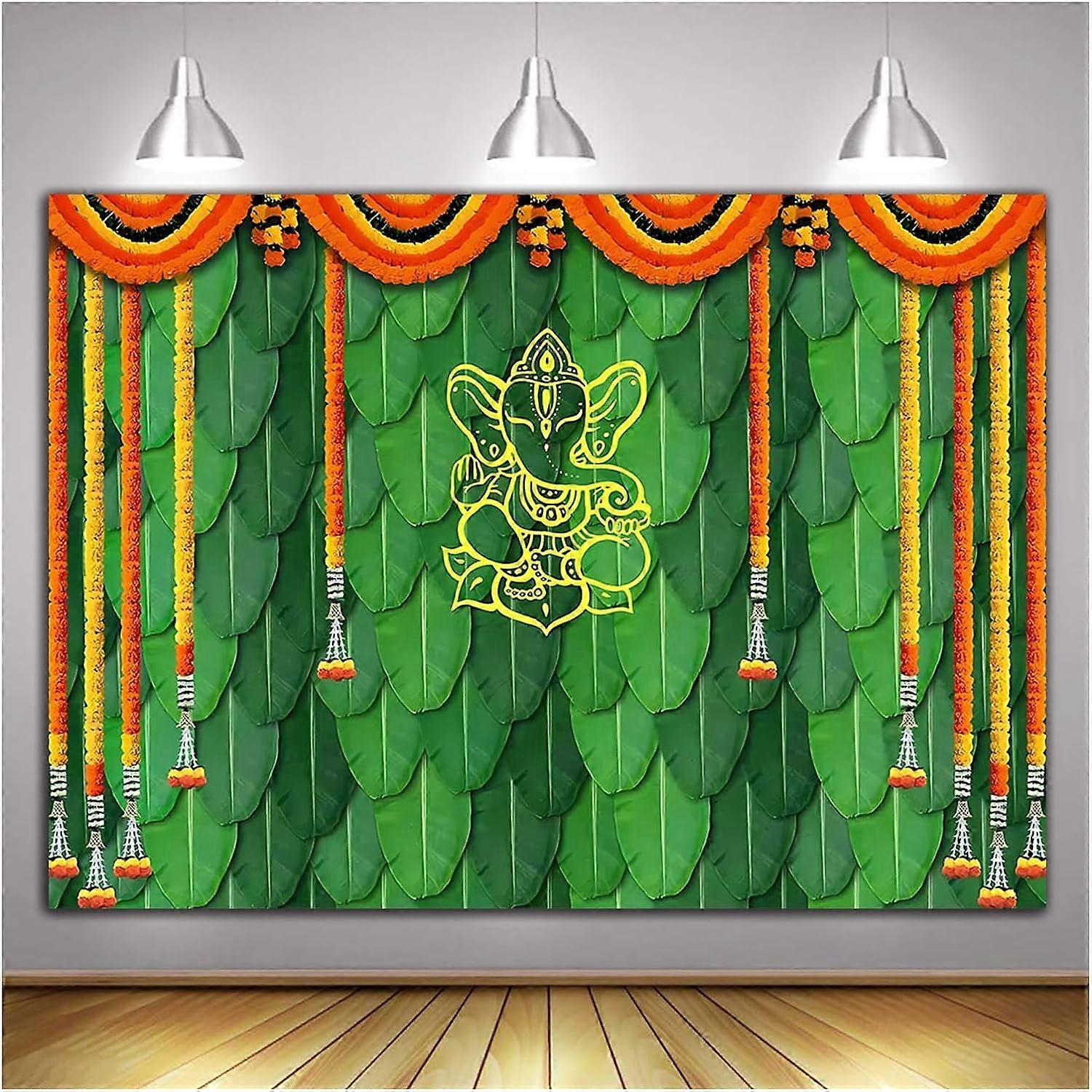 8x6FT Carnival Photography Backdrop Banana Leaf Green Chatiya Ganesh Background Mehndi Diwali Festival Marigold