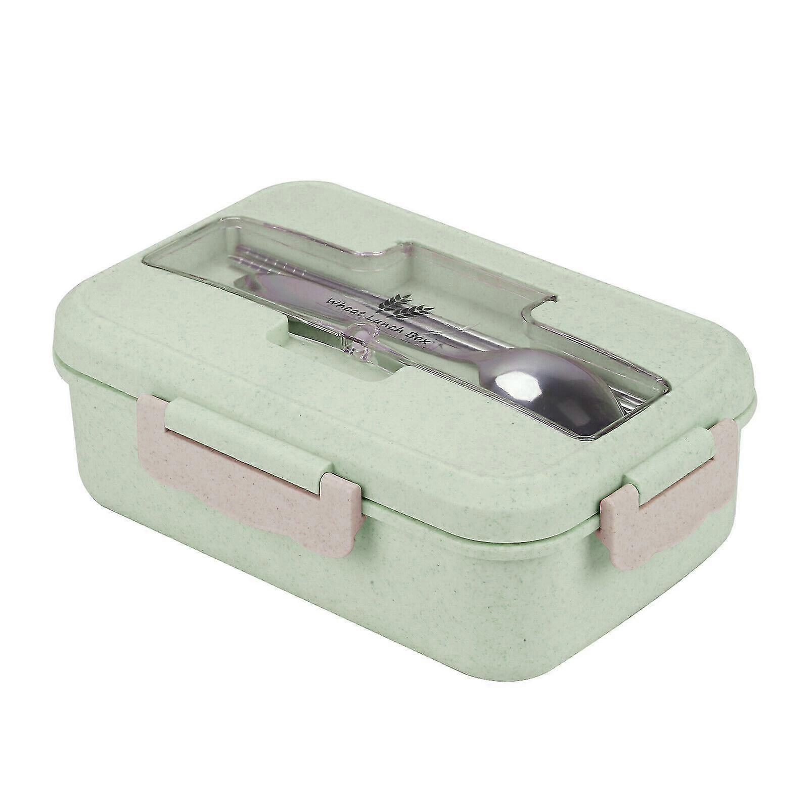 : .Designed in 3 compartments avoid tainting.Easy to carry & clean, suitable for microwave ovens.Made of food grade wheat straw and PP materials, safe and healthy. The side buckle of the lunch box is designed to be easily opened and closed, sealed very well to prevent leakage of food, and is ideal for picnics.Comes with a spoon and chopsticks, you do not need to prepare other tableware and they are stored for safe and clean use. Lightweight containers are easy to carry, and the food won't spill. The design of the box inside the box can prevent the taste of the food string and better preserve the food.Specifications:Type: Lunch BoxSize: 20*13*7cmMaterial: wheat straw + PP + stainless steelColour: GreenPinkBlueCapacity: about 1000mlApplicable: going to school, going to work, picnicking, etc.Package includes:1 x lunch box (including chopsticks, spoon) Note: Due to the light and screen setting difference, the item's color may be slightly different from the pictures. Please allow slight dimension difference due to different manual measurement.