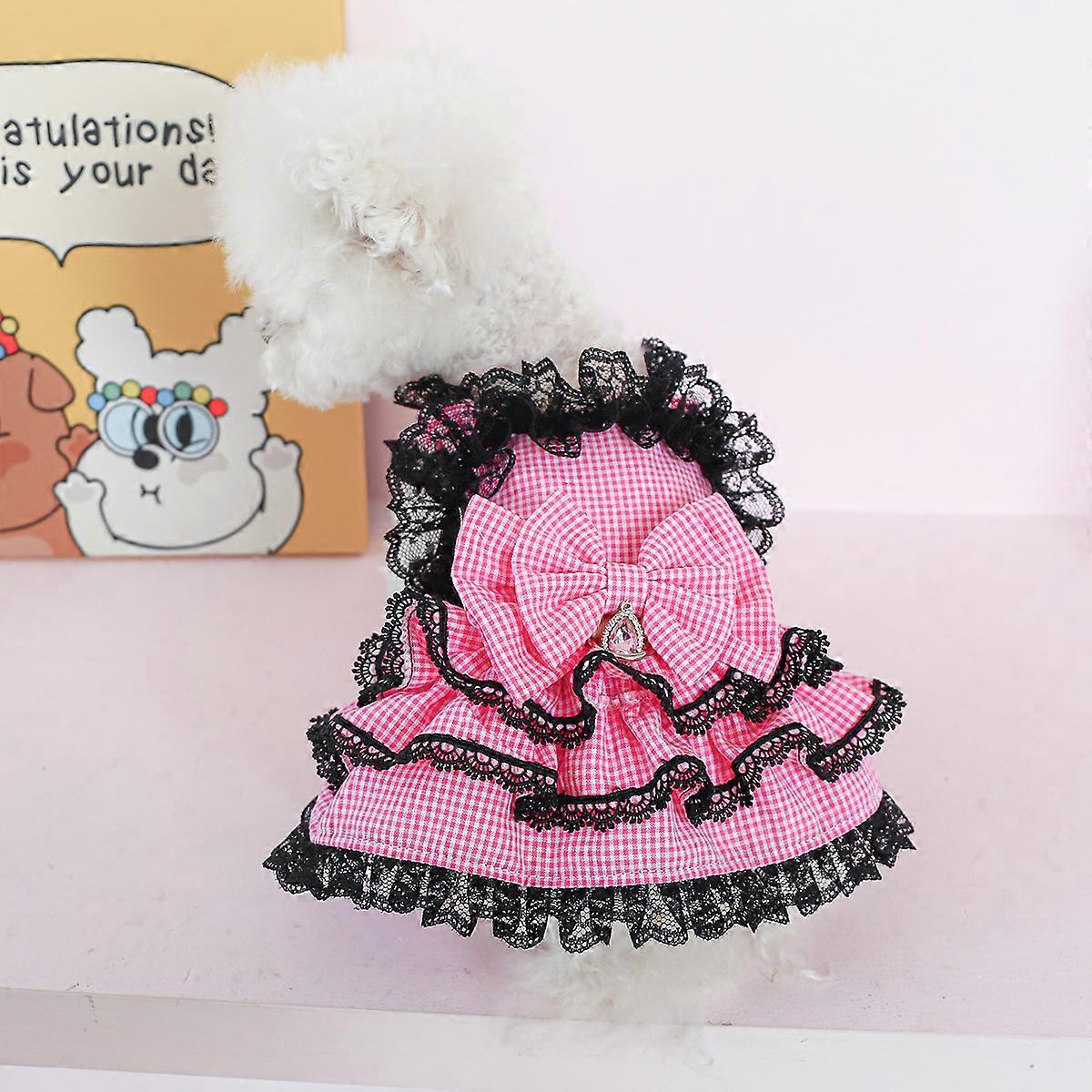 Pet Spring Bow Dress Small and Medium Sized Dog Princess Casual Flower Pink Checkered Strap Top Puppy Clothes