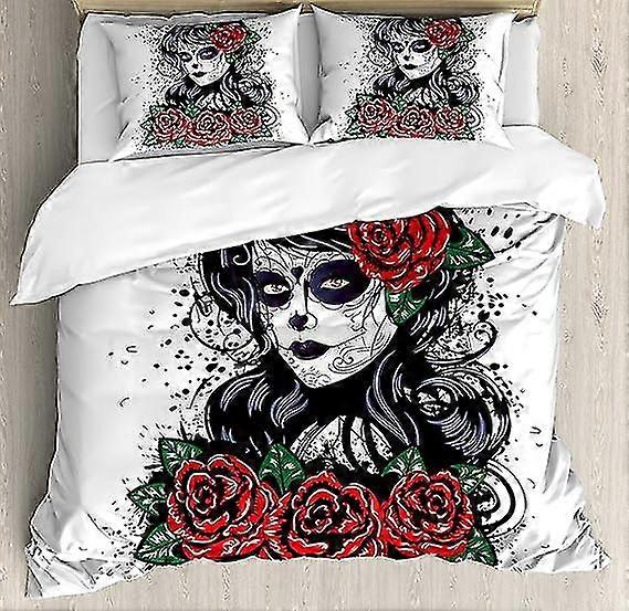 25-26 Tête De Mort Housse De Couette Ensemble Cheveux Morts En Forme De Sucre Dame Roses En Encre Rétro Style Design Mexicain Folk Imprimé E