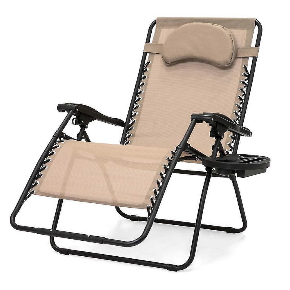 Oversized Folding Outdoor Patio Lounge Recliner, Zero Gravity Extra-Wide Chair w/Cup Holder Accessory Tray and Removable Pillow - Beige
