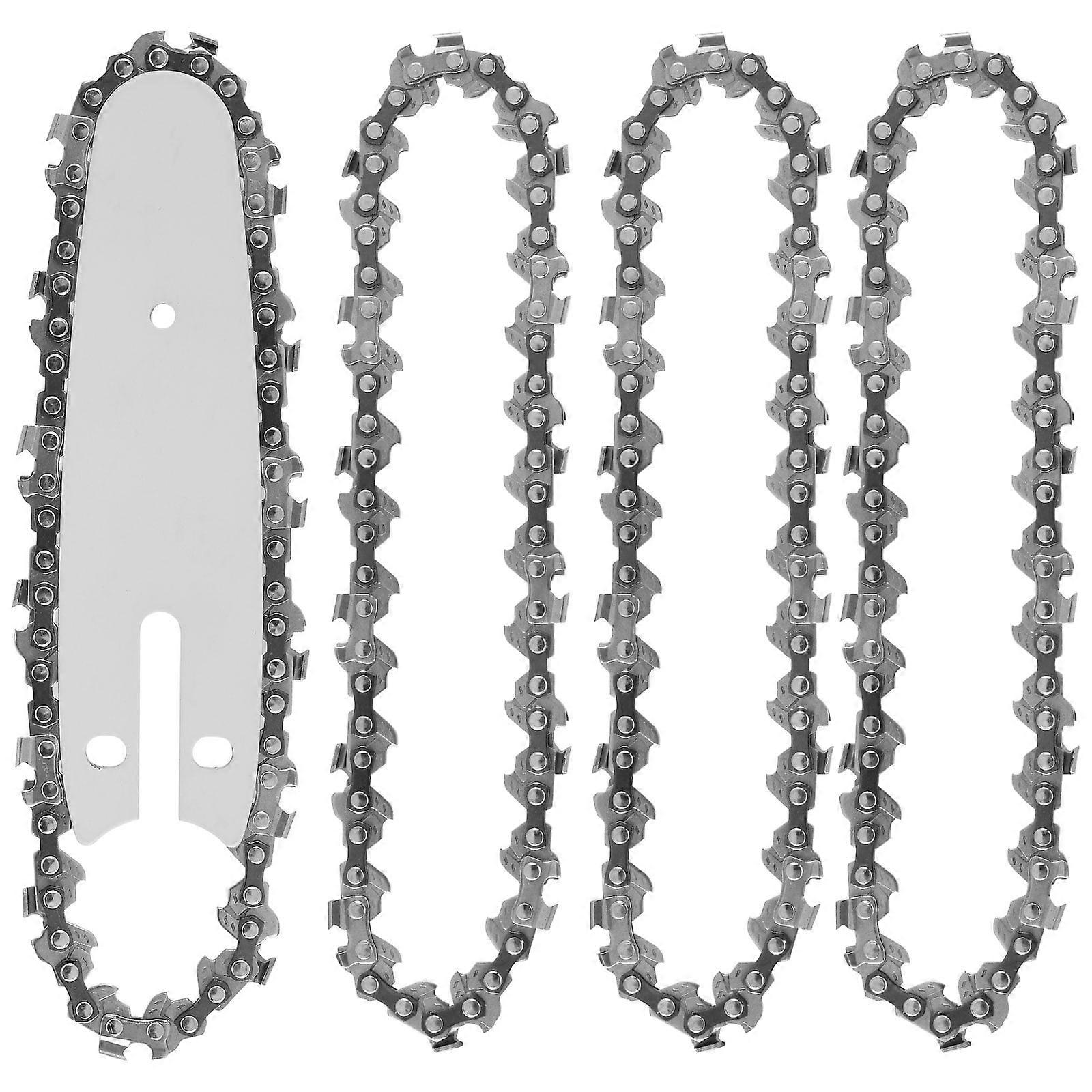 Parts List: 4×Chains 1×Guide Plate Highlight description: [Scope of Application] Our mini chainsaw chain is suitable for 4/6inch mini cordless electric chainsaws, 4/6inch original chainsaws, 4/6inch original chain of rechargeable chainsaw. Each chain is individually sealed and packaged for easy storage. [Efficient and Practical] The pointed teeth are wear-resistant and high efficient to cut. It has high hardness and faster to use. The engraving chain is not easy to break, enduring and providing more convenience and save time. [Lightweight and Smooth Cutting] The chain is deeply hardened to ensure smooth cutting and optimal lubrication. The saw chain lasts longer, which is lightweight (only 1.8 ounces) and wear-resistant. It is easy to install and replace. [Easy to Install] Just turn the screw, remove the original chain, replace with the new chain, and finally tighten the screw. When installing and replacing the chain, please pay attention to the installation direction of the chain. It is lightweight to replace and install. [After-sales] If you have any questions, please get in touch with us, our service team will provide you with a professional and satisfactory service. Detailed description: Product Name: Mini Chainsaw Chain Material: Metal Size (Optional): 4-inch chain: 28 sections/14 cutters; Chain folded length: about 17.5cm; Guide plate length: about 13cm 6-inch chain: 37 sections/18 cutters; Chain folded length: about 23.5cm; Guide plate length: about 18.5cm Color: Silver Notes: 1.There may be slight differences between the picture and the actual color of the commodity. We will try our best to show you the exact color. 2.Please allow slight dimension difference due to manual measurement. [Scope of Application] Our mini chainsaw chain is suitable for 4/6inch mini cordless electric chainsaws, 4/6inch original chainsaws, 4/6inch original chain of rechargeable chainsaw. Each chain is individually sealed and packaged for easy storage. [Efficient and Practical] The pointed teeth are wear-resistant and high efficient to cut. It has high hardness and faster to use. The engraving chain is not easy to break, enduring and providing more convenience and save time. [Lightweight and Smooth Cutting] The chain is deeply hardened to ensure smooth cutting and optimal lubrication. The saw chain lasts longer, which is lightweight (only 1.8 ounces) and wear-resistant. It is easy to install and replace. [Easy to Install] Just turn the screw, remove the original chain, replace with the new chain, and finally tighten the screw. When installing and replacing the chain, please pay attention to the installation direction of the chain. It is lightweight to replace and install. [After-sales] If you have any questions, please get in touch with us, our service team will provide you with a professional and satisfactory service.