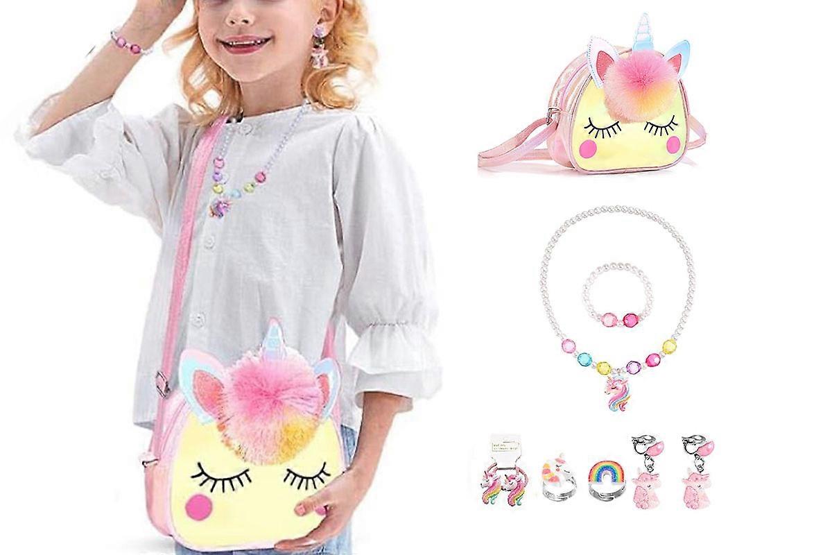 Delight your princess with this adorable purse for girls. 9Pcs Plush Shoulder Type: Features: Includes 1 shoulder bag, 2 stickers, 1 bracelet, 1 necklace, 2 rings, and 2 earrings. Made from high-quality plush material, soft and refined, helping your kids feel more confident. The bracelet and necklace set is elastic, suitable for people of different ages, making it a favorite for your little princess. Lightweight and convenient, this adorable shoulder bag offers ample space inside to easily hold your princess's daily essentials. The adjustable shoulder strap can be set to the perfect length for your girl, making it ideal for various occasions and outfits. The bag features colorful and vibrant embroidery, allowing your girl to embrace her imagination and step into a fantasy world. Specification: Material: Plush Color: Pink Crossbody Bag Size(LxWxH): 18 x 5 x 13 cm Package Content: 1 x Shoulder Bag 2 x Stickers 1 x Bracelet 1 x Necklace 2 x Rings 2 x Earrings Please Note: Due to manual measurement, there might be a tolerance in the product size. Due to the lighting effects and shooting angles, the color of the item and that shown in the picture might have a nuance.
